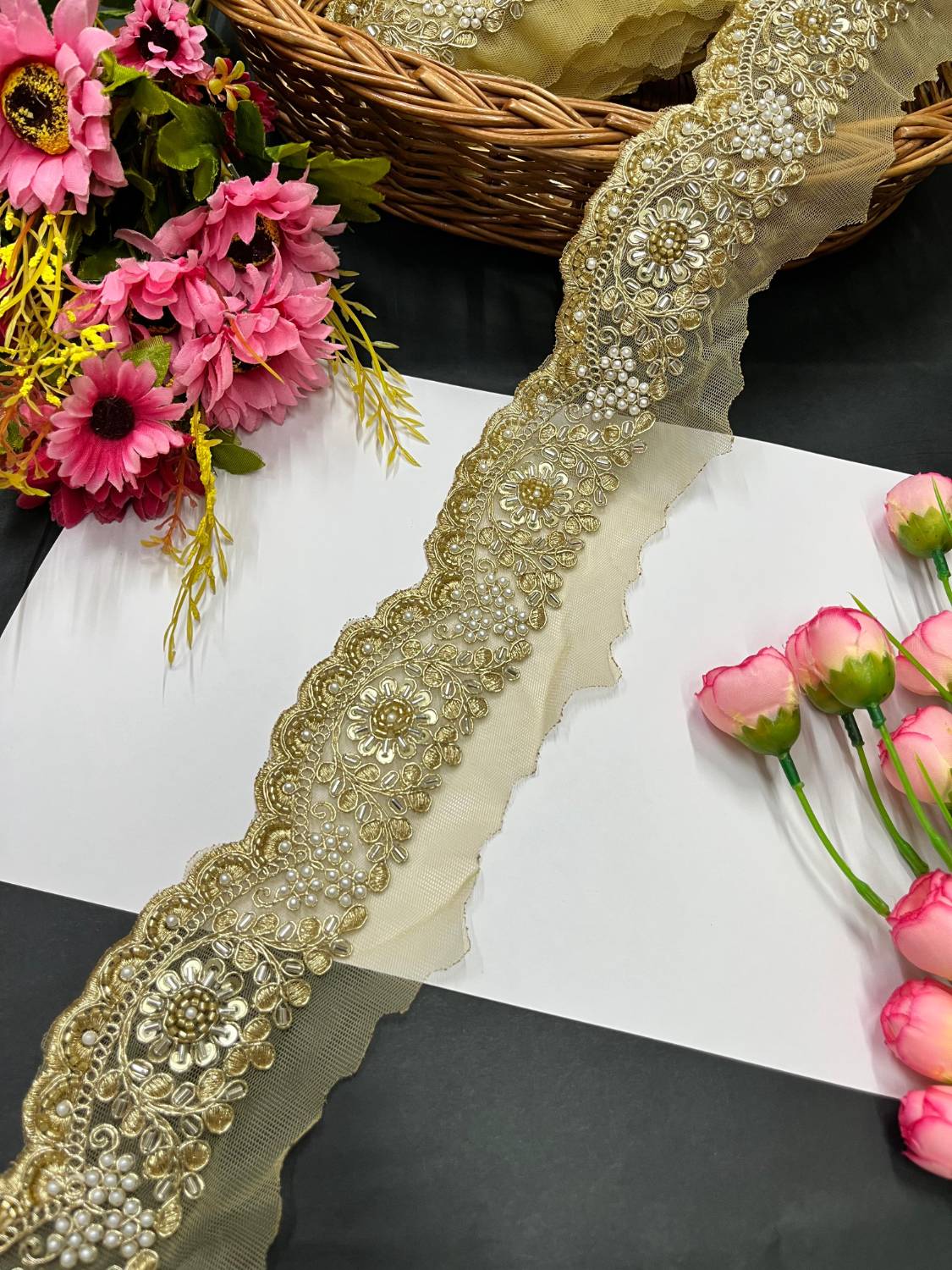 Beaded & Pipe Work Designer Lace Border – Intricate Detailing for Ethnic Wear (9 Meter) | Gold