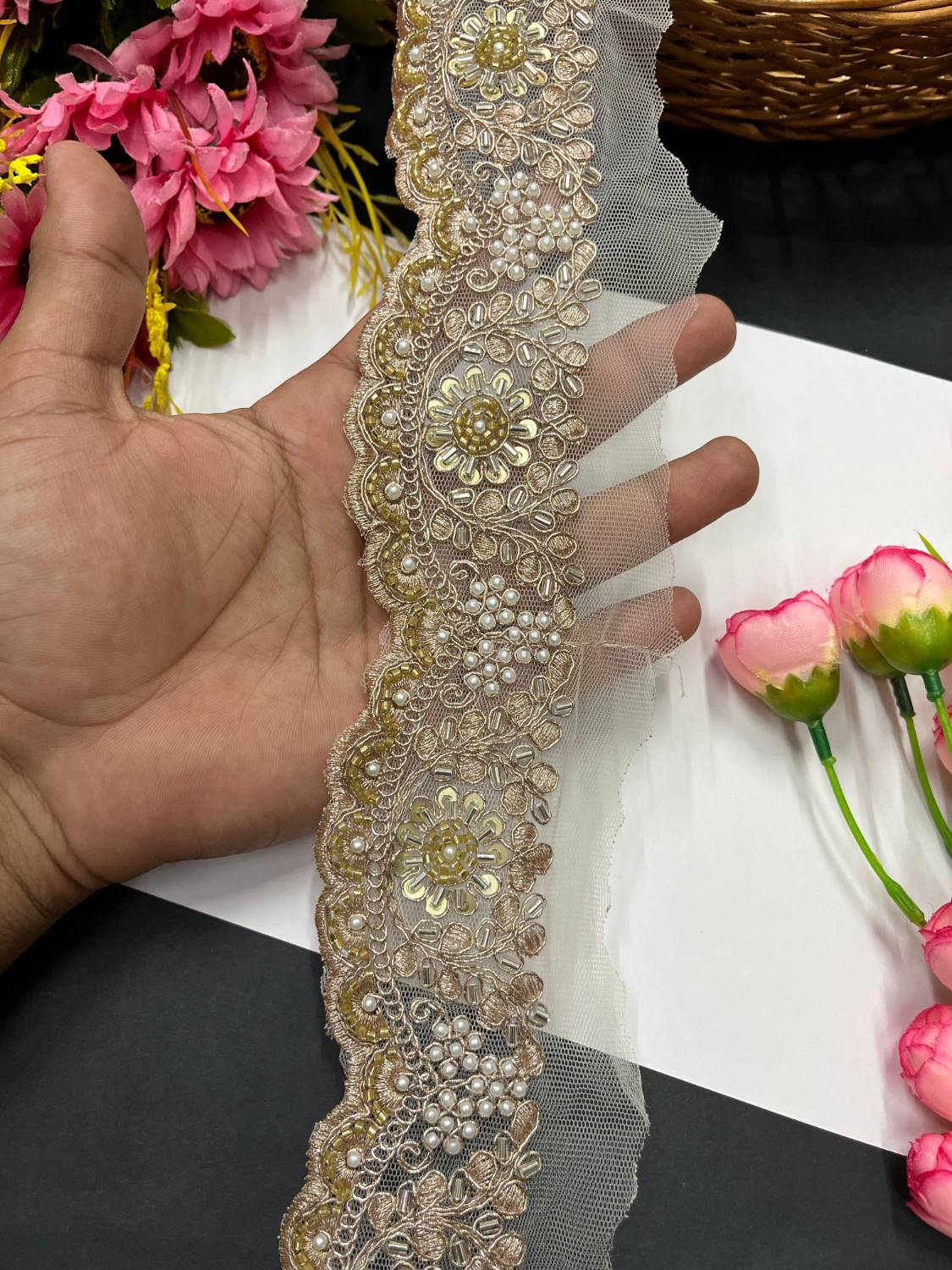 Each saree border and lace features delicate embroidery, sequins, or beading. This stage involves carefully layering details to create depth and texture, giving each product a distinctive, luxurious look.