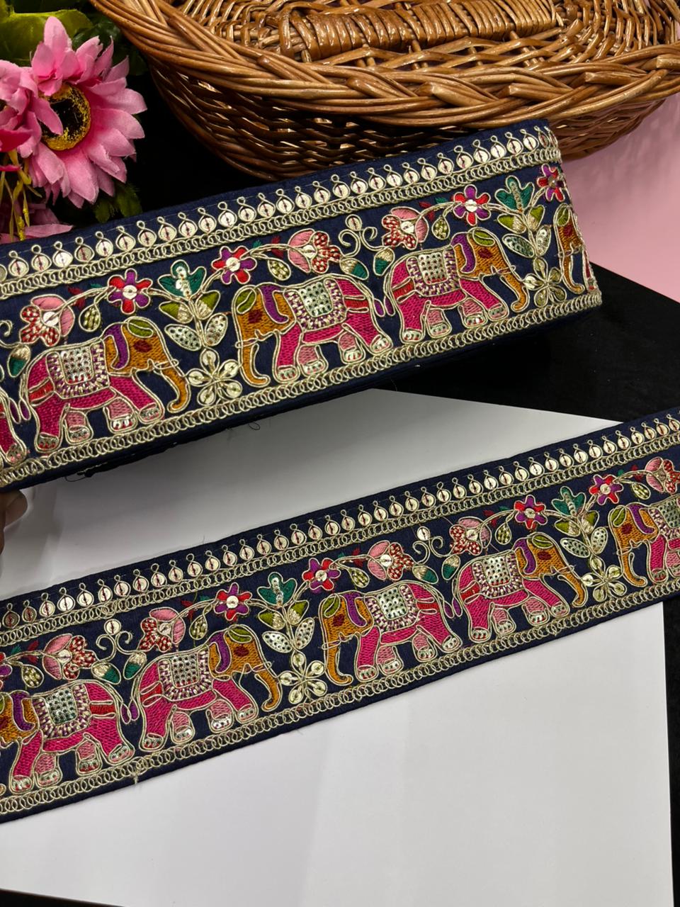 Beautiful Elephant Design Embroidered Zari Saree Lace – Premium Designer Embroidered Lace | Navy Blue