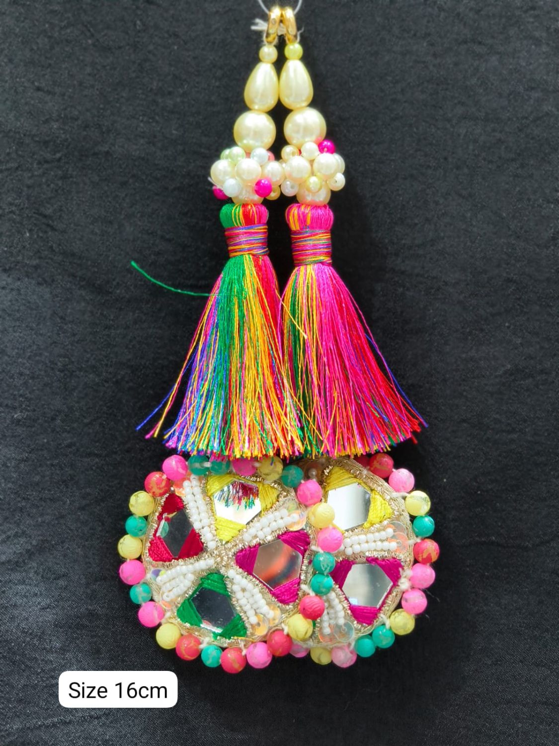 - Handcrafted tassels made with vibrant multi-colored resham threads and shimmering mirror accents
