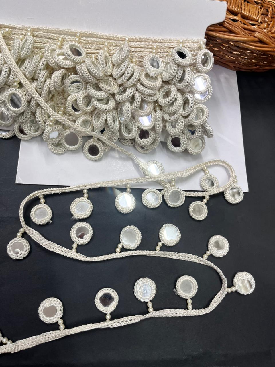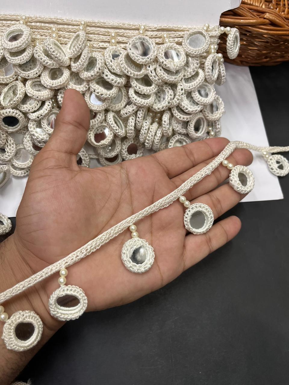 Crochet Mirror Hanging Laces – Handmade Latkan Border Trim for Sarees, Dupattas & Ethnic Wear (9 Meter) | White Round