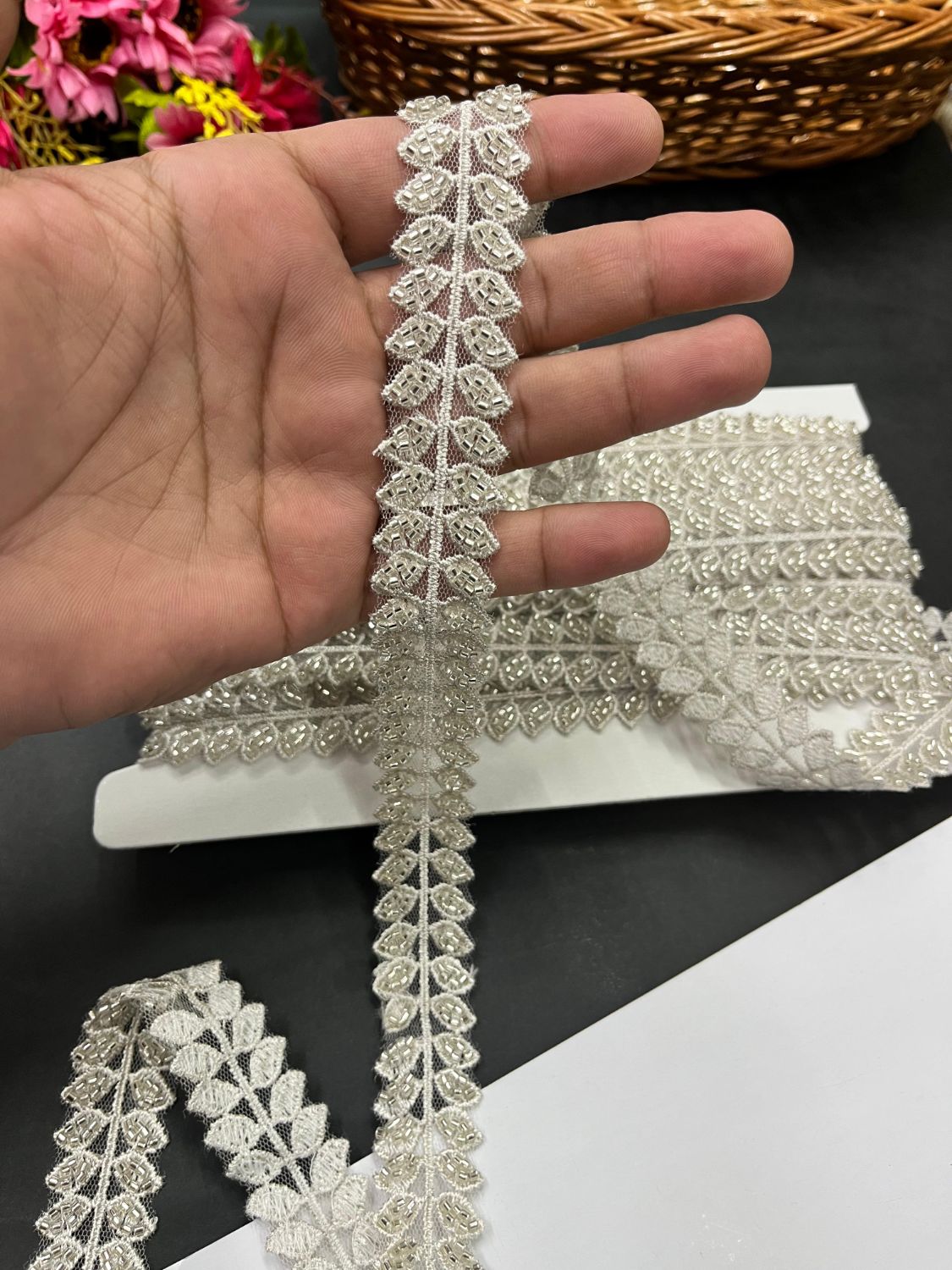 Each saree border and lace features delicate embroidery, sequins, or beading. This stage involves carefully layering details to create depth and texture, giving each product a distinctive, luxurious look.