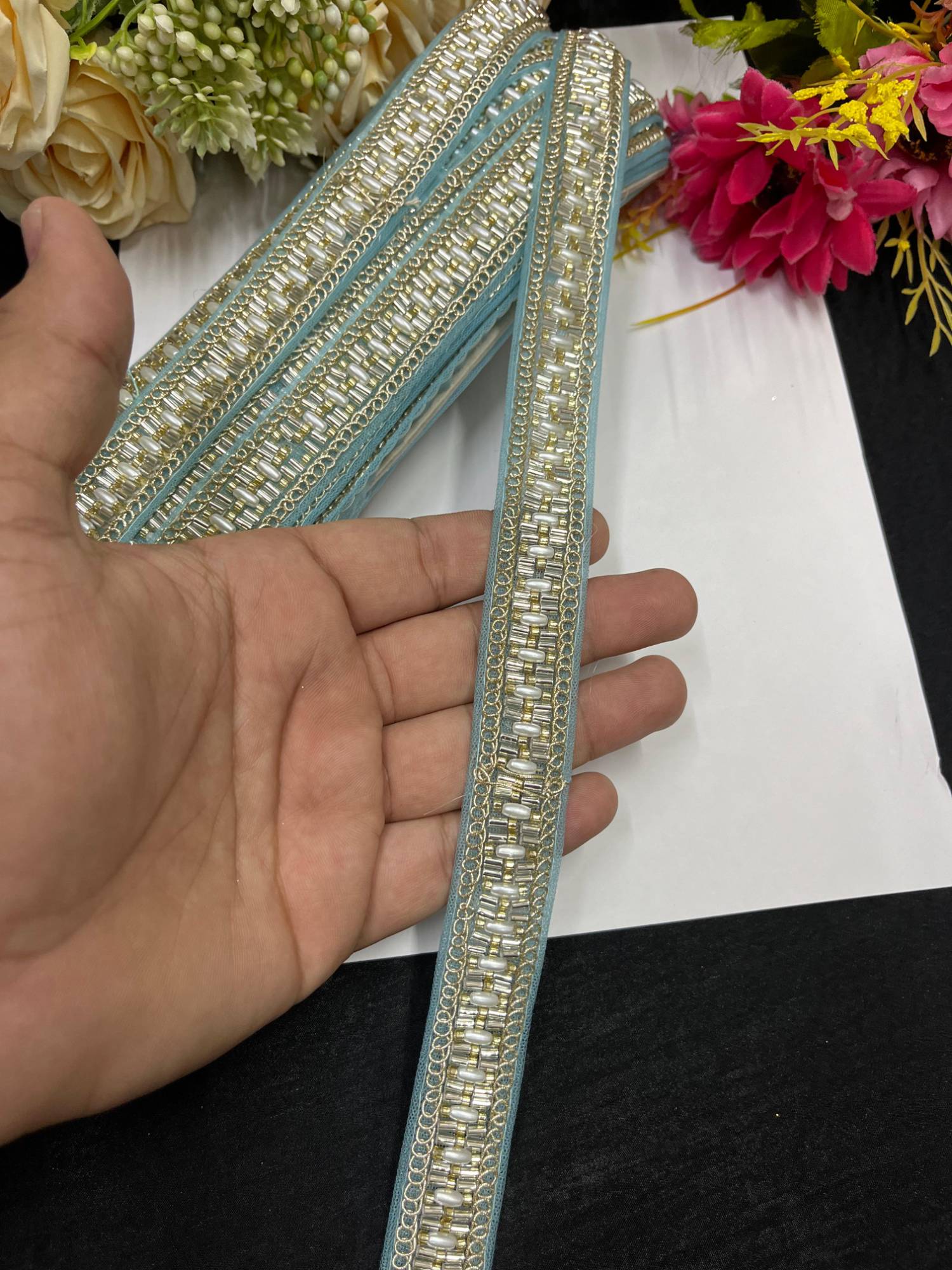 Delicate Pearl Work Designer Saree Laces – 9 Meters, 1-Inch Maggam Work Border for Sarees, Lehengas & Dupattas | Sky Blue