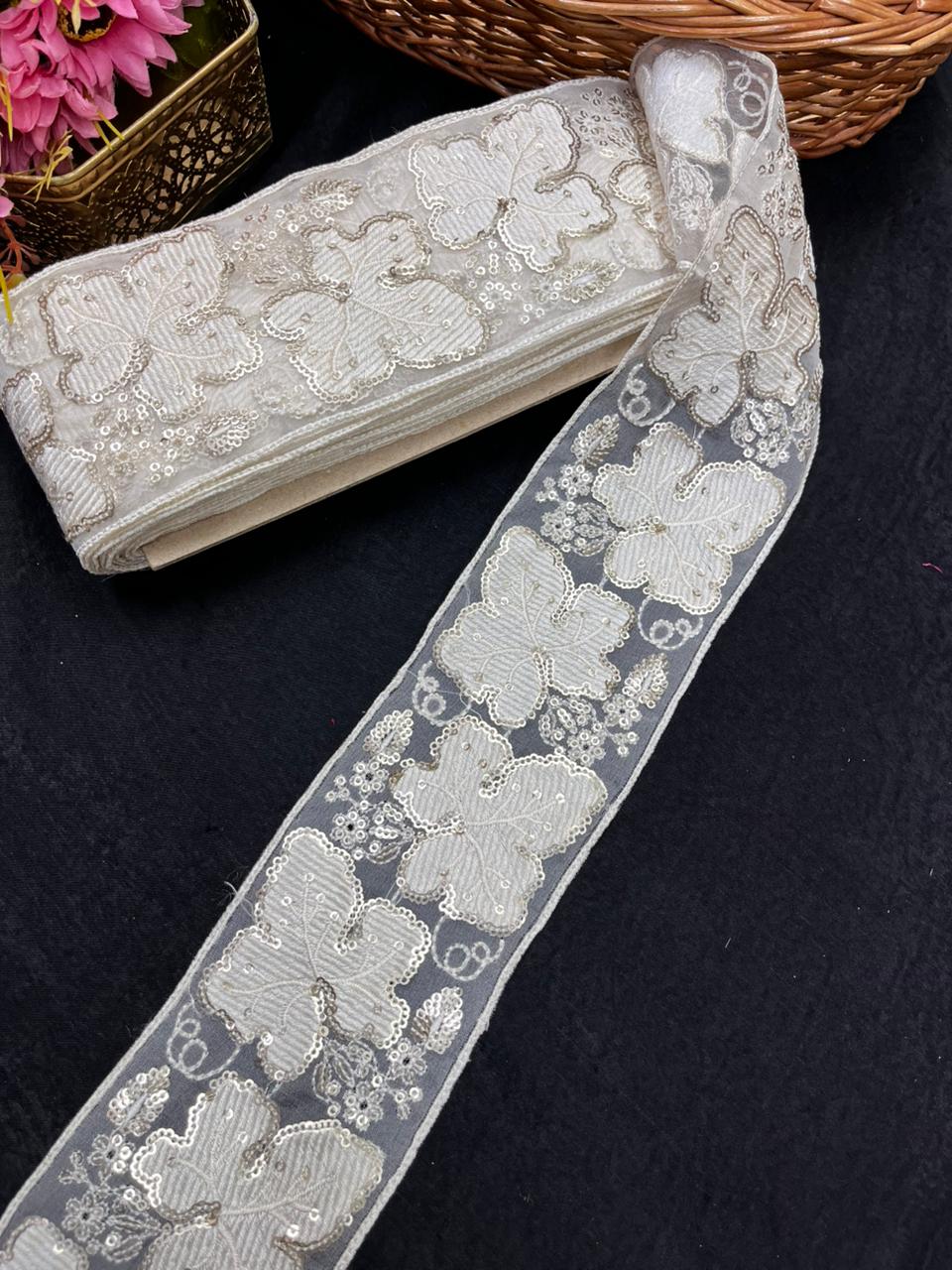 - Designer leaf style Lucknowi lace crafted with elegant embroidery to enhance sarees, kurtis, dresses and ethnic garments