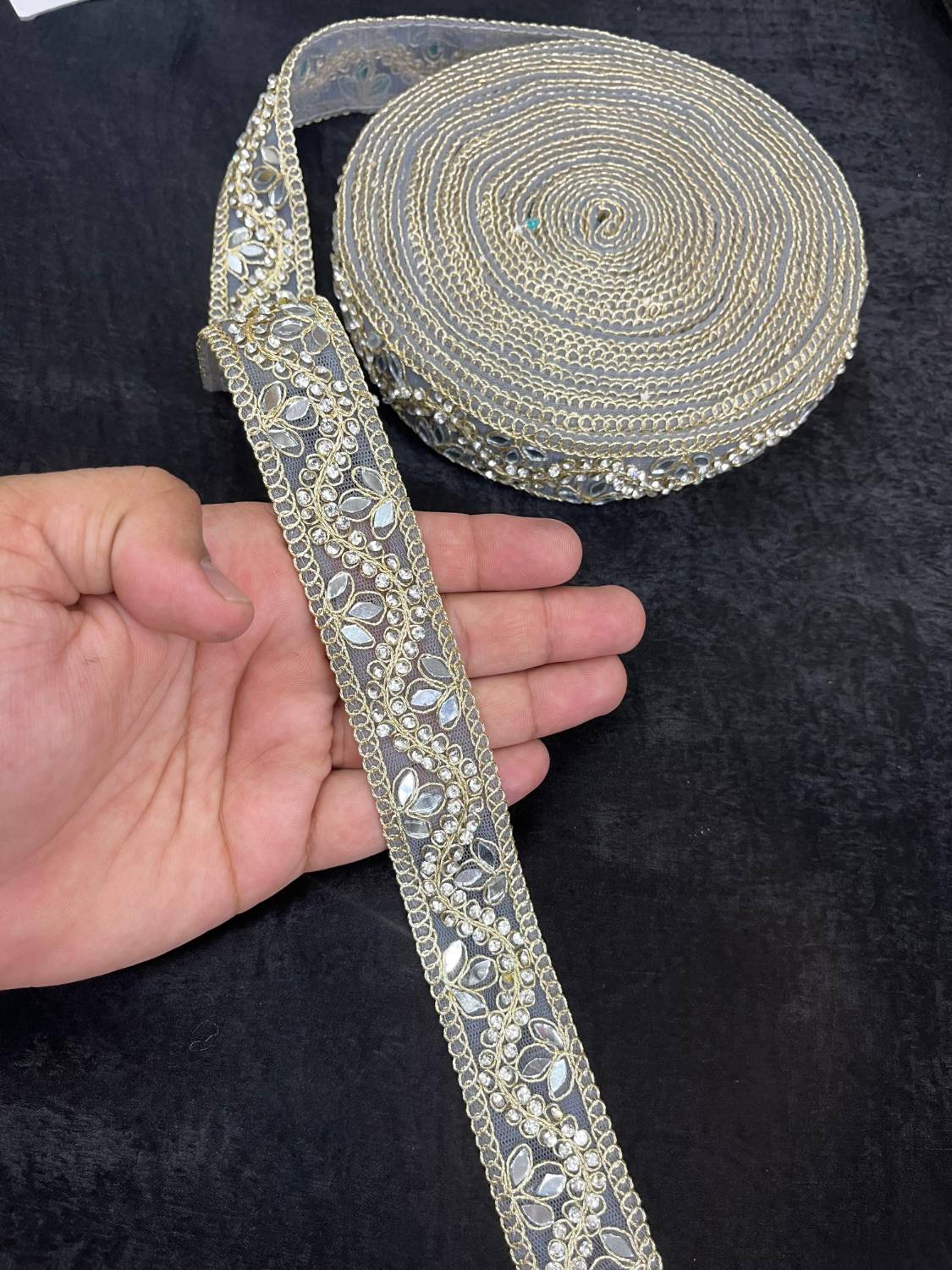Designer Mirror Work Lace Trim with Rhinestones – Elegant Border for Sarees, Dupattas & Lehengas (9 Meter, 1 Inch Width) | Grey