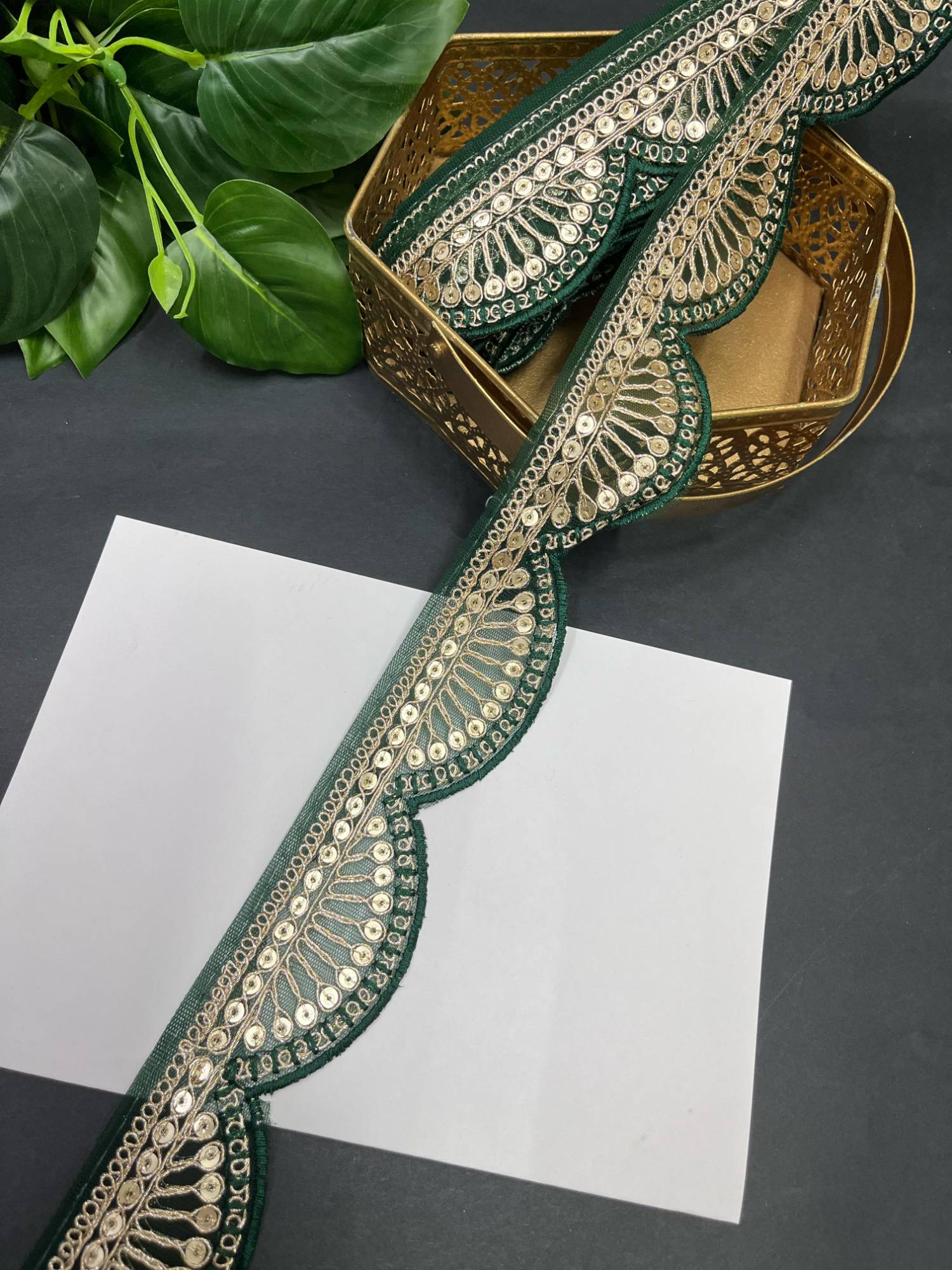 Designer Scalloped Embroidery Saree Lace – 9 Meters, 2-Inch Tone-to-Tone Embroidered Border for Lehengas & Dupattas | Bottle Green