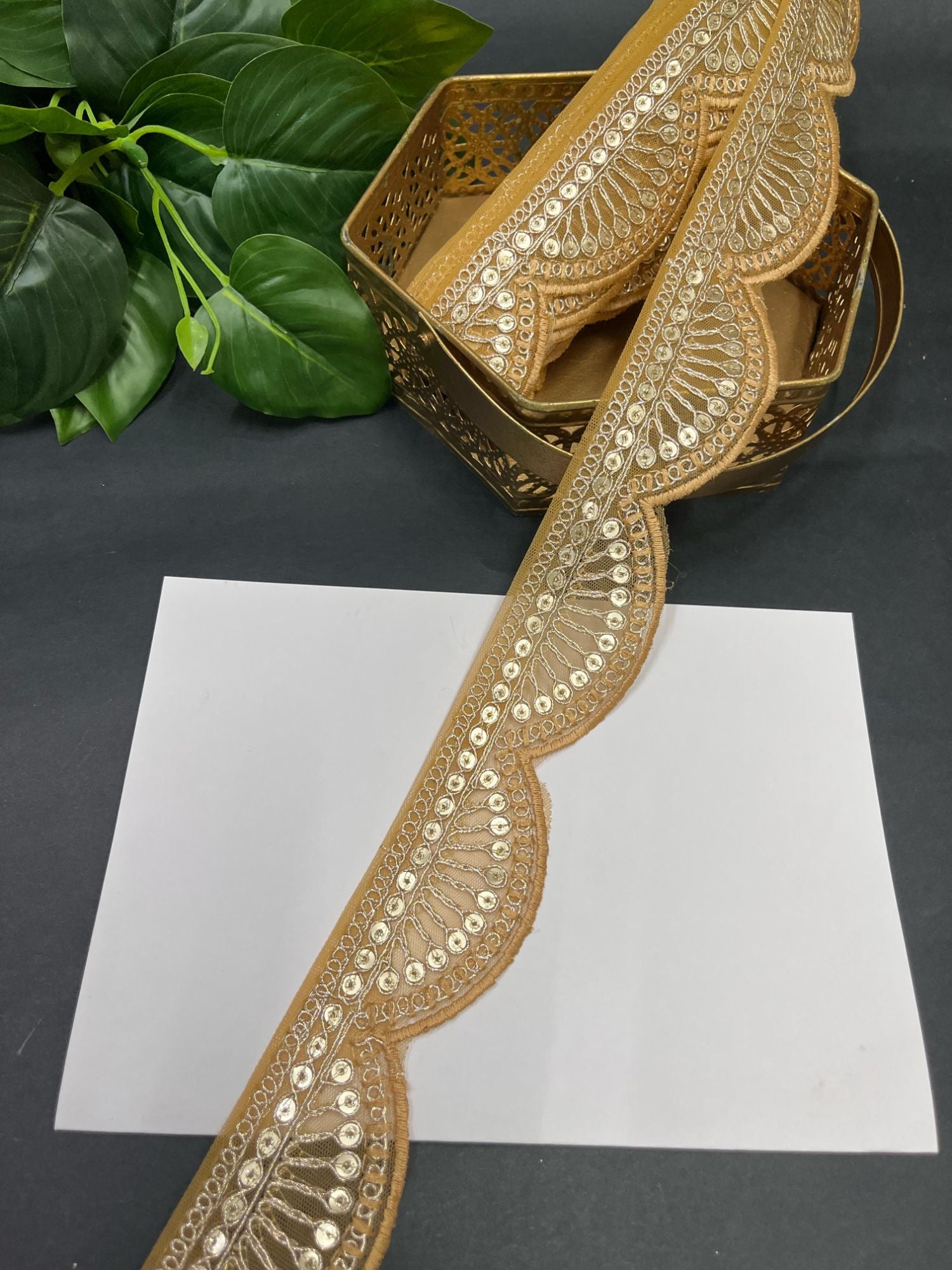 Designer Scalloped Embroidery Saree Lace – 9 Meters, 2-Inch Tone-to-Tone Embroidered Border for Lehengas & Dupattas | Golden