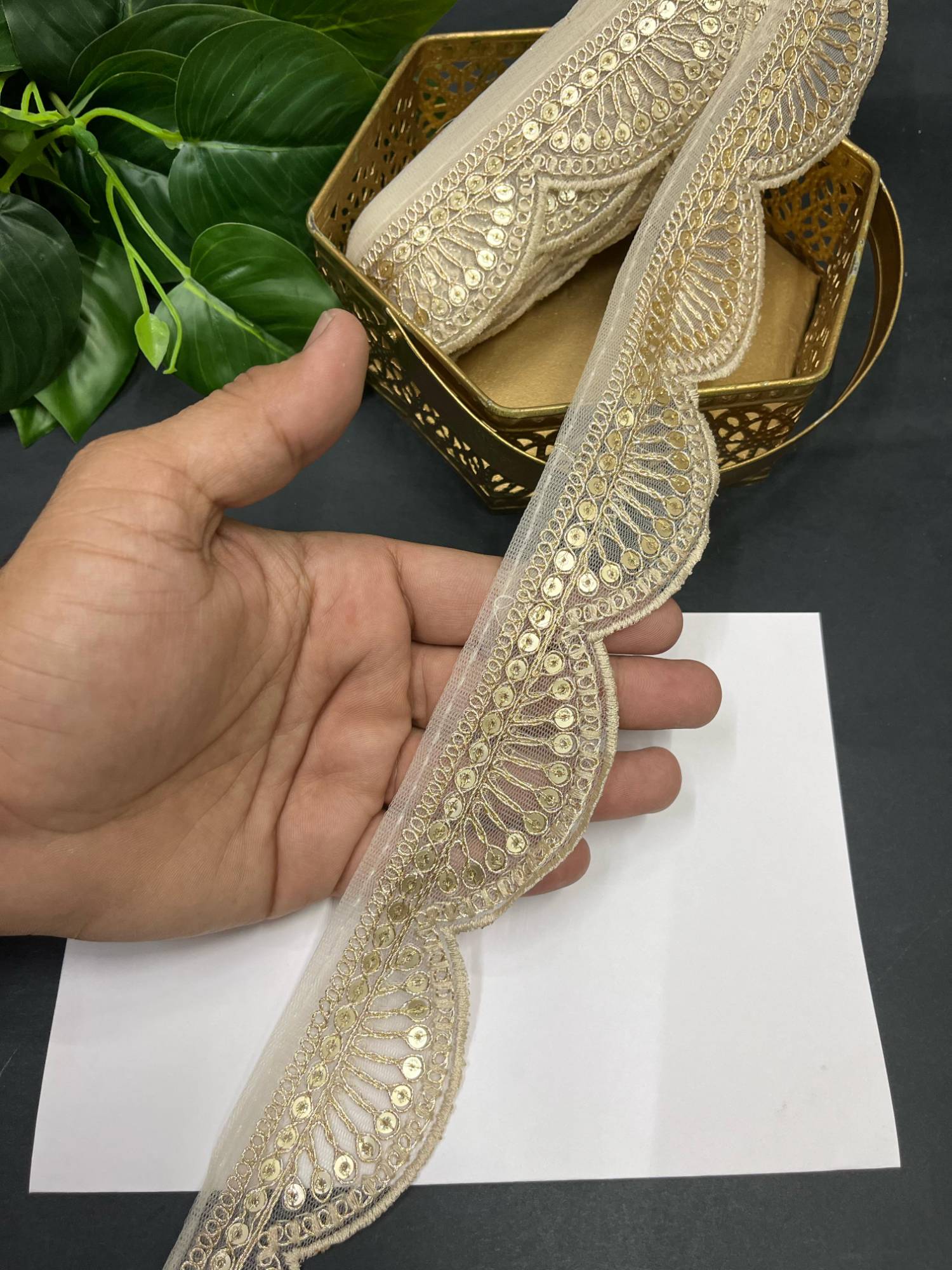 Designer Scalloped Embroidery Saree Lace – 9 Meters, 2-Inch Tone-to-Tone Embroidered Border for Lehengas & Dupattas | Light Gold