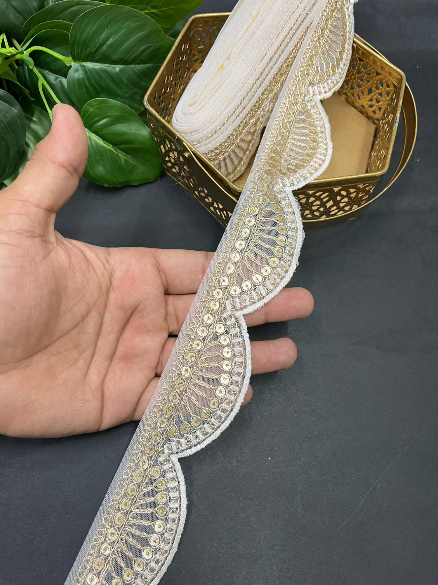 Designer Scalloped Embroidery Saree Lace – 9 Meters, 2-Inch Tone-to-Tone Embroidered Border for Lehengas & Dupattas | White