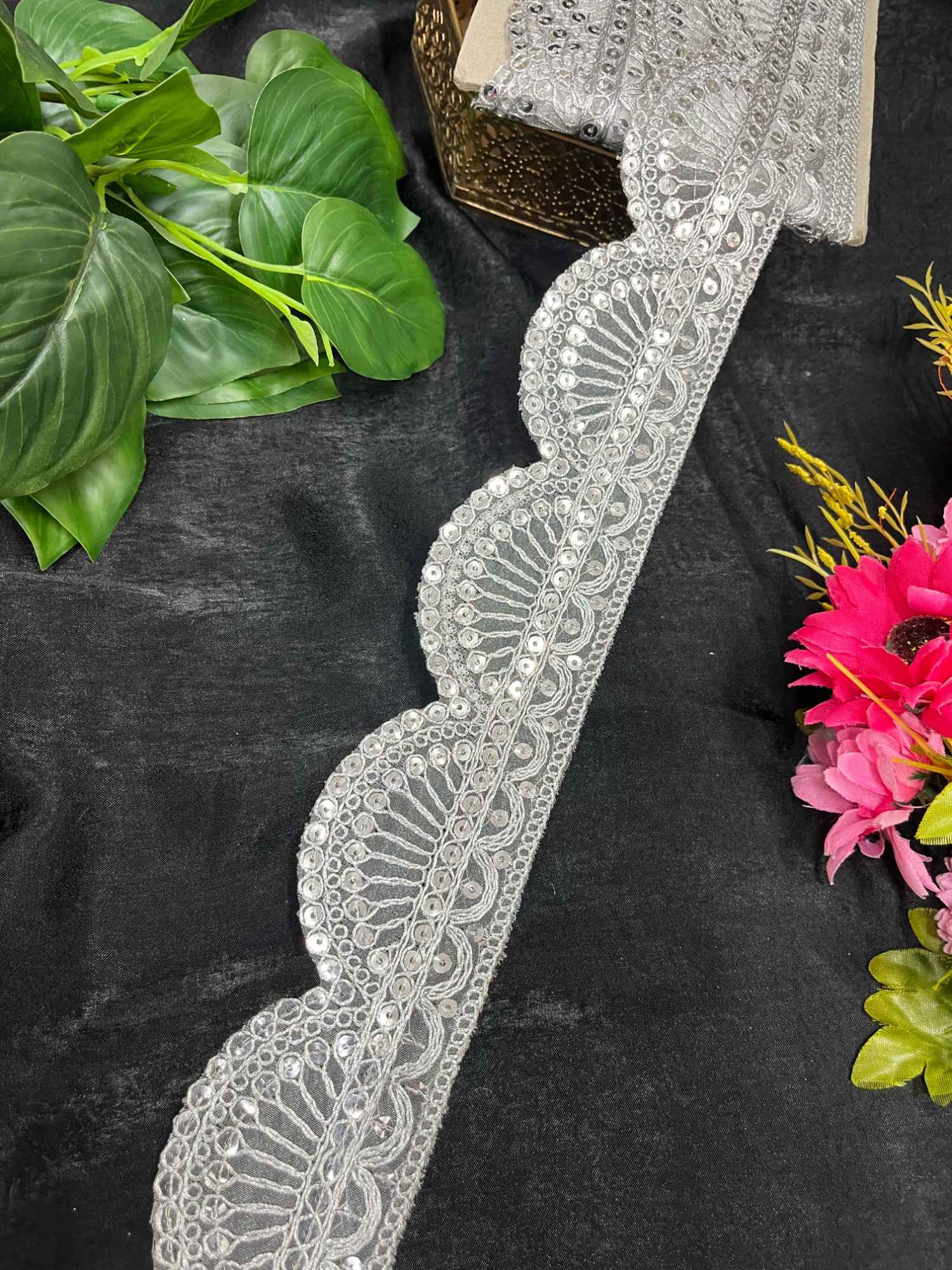 Elegance Gold Sequin Scallop Lace – 9 Meters, 2-Inch Embroidered Border for Sarees, Lehengas & Dupattas | Silver