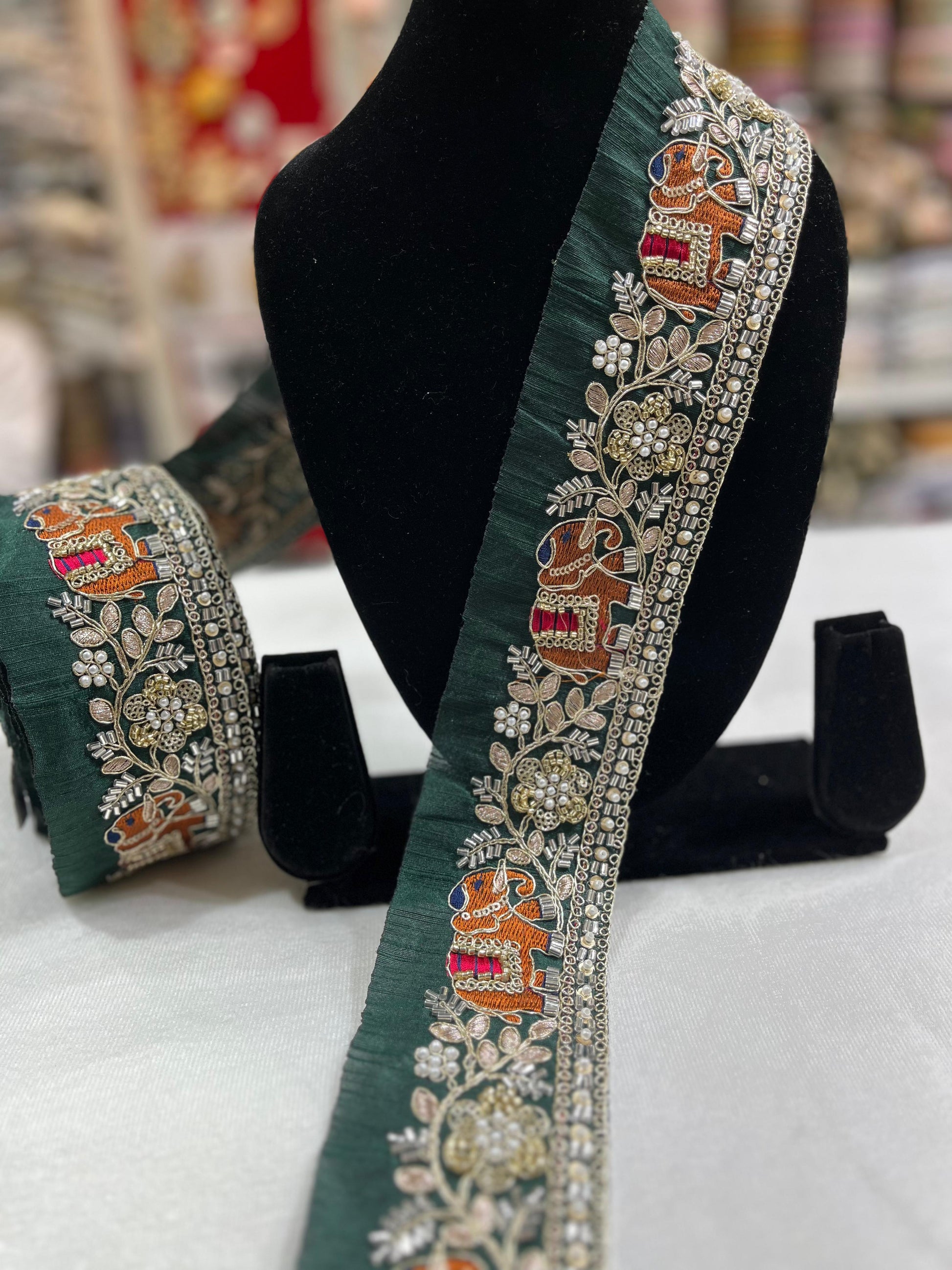 Elephant Handwork Cutdana & Pearl Embroidered Lace Border – 9 Meters, 3-Inch Width | Bottle Green