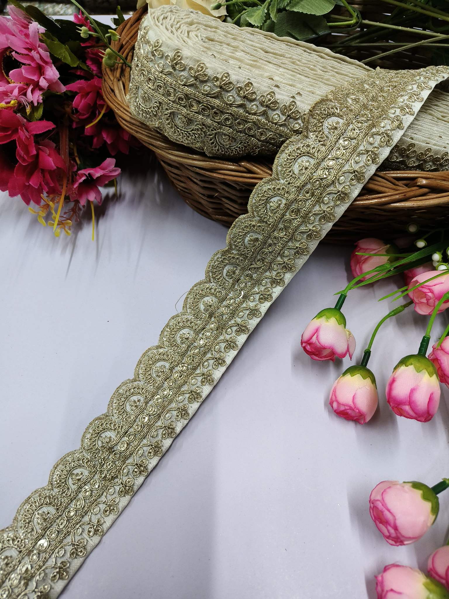 We source only the finest materials, including high-quality threads, beads, sequins, and fabrics. Our commitment to quality ensures that every saree border, lace, and blouse is durable and visually appealing.