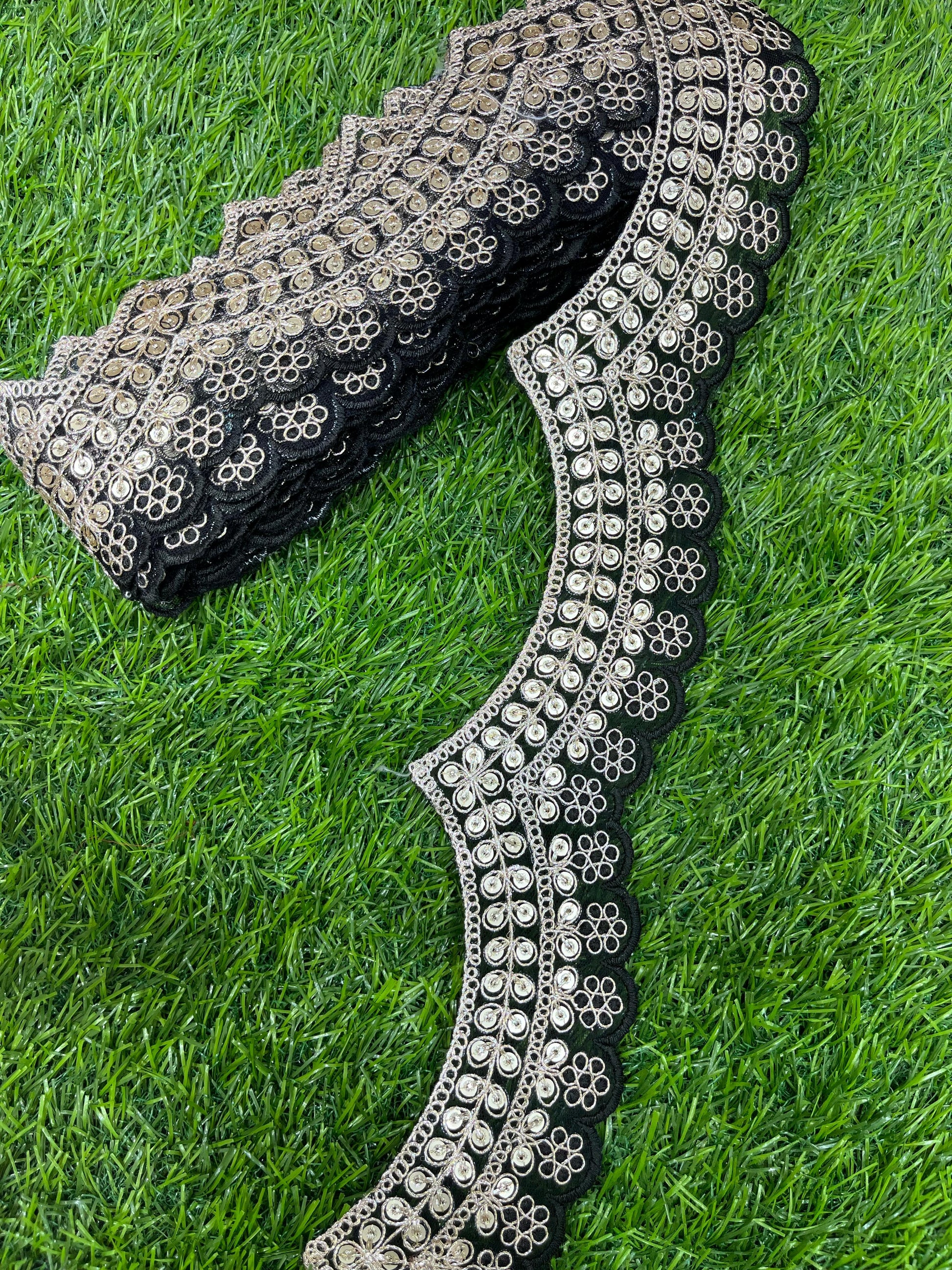 Embroidery Scallop Lace | Sequins Embellishment Trim | Craft Decorative Saree Lace – 9 Meters, 2-Inch Width | Black