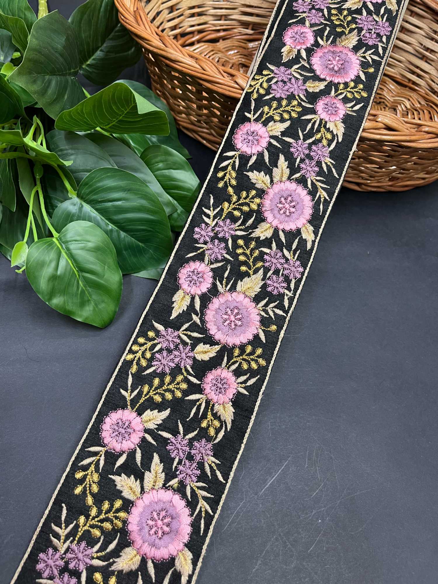 Floral Embroidered Trim | Sari Border Embellishment | Decorative Indian Embroidered Trim – 9 Meters, 3-Inch Width | Purple