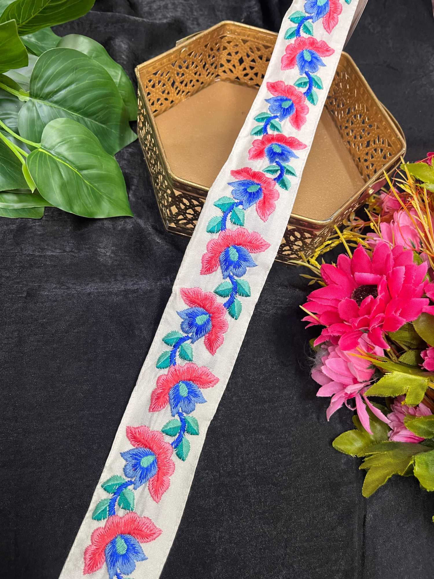 Floral Embroidered Trim | Thread Embroidery Parsi Lace – 9 Meters, 2-Inch Decorative Border for Sarees, Lehengas & Dupattas | White & Firozi