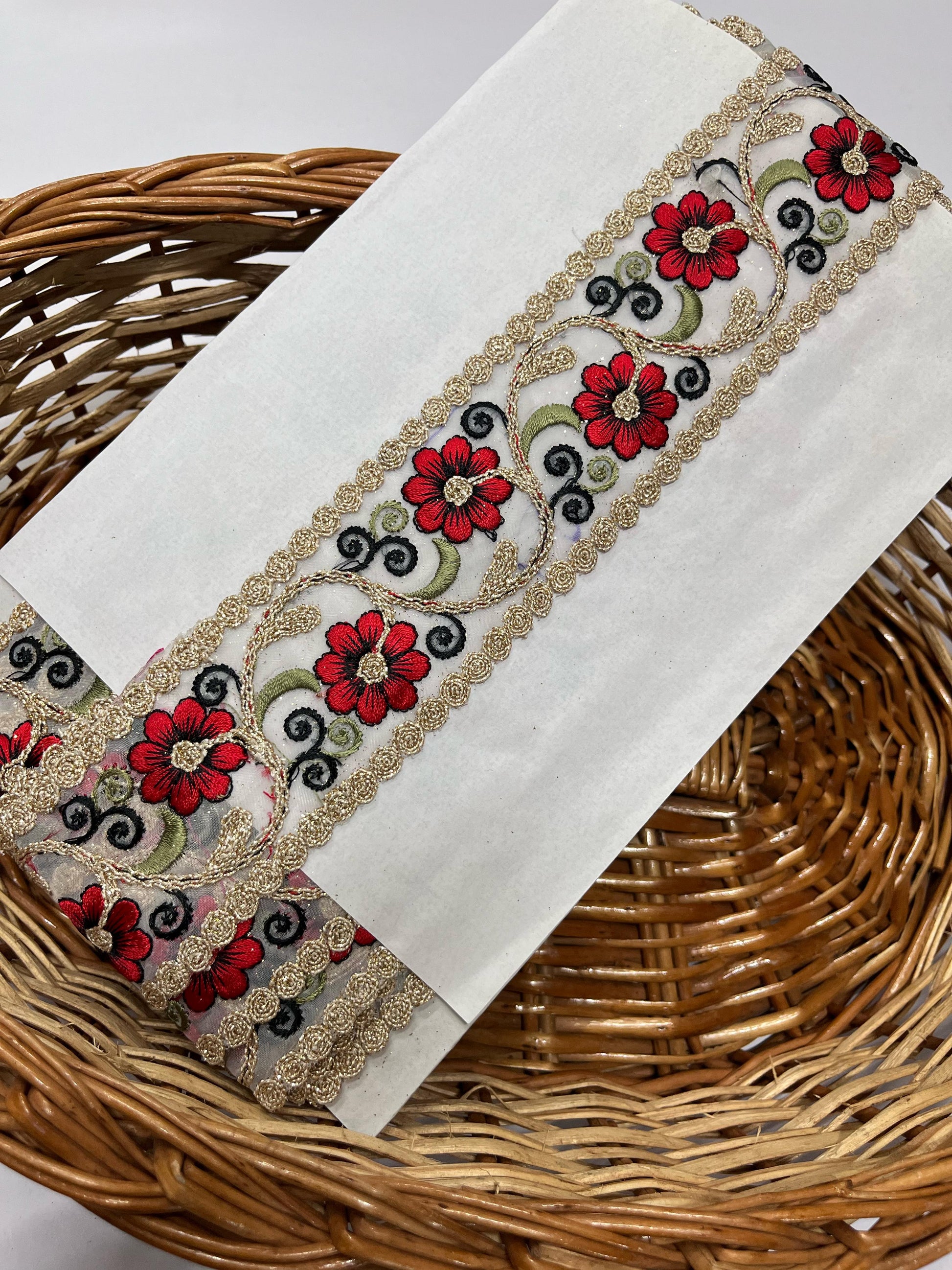 Flower Embroidered Lace Border | Saree Lace | Lehenga Lace | Dupatta Lace – 9 Meters, 2-Inch Width | Red