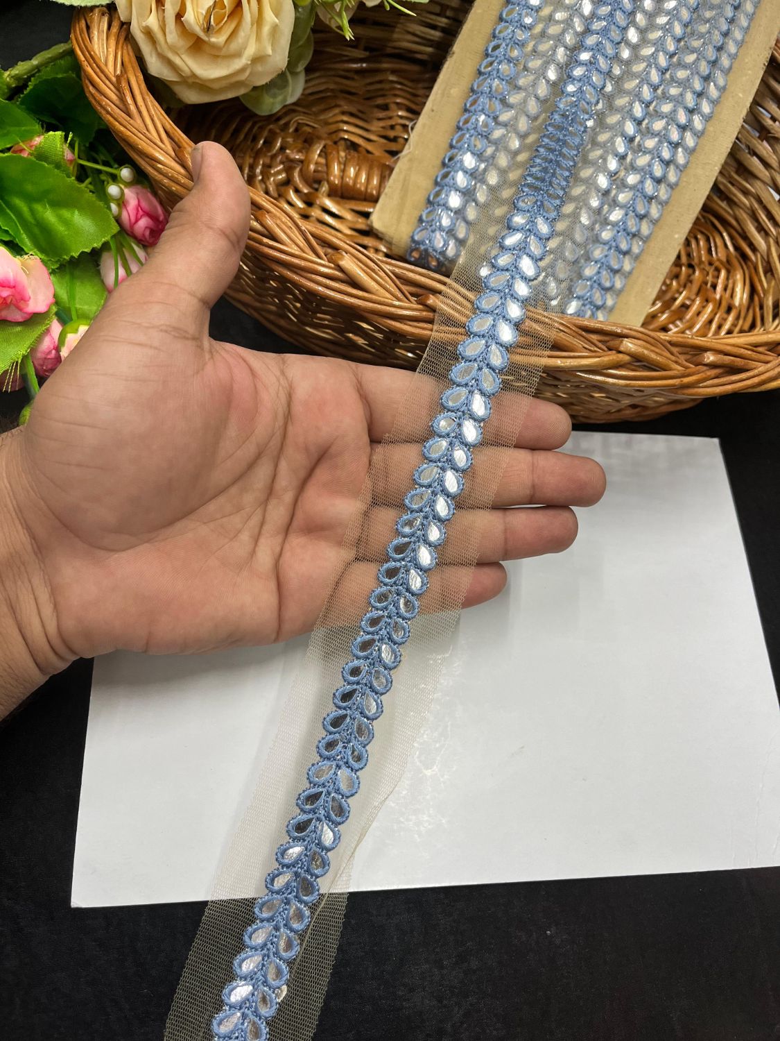 Foil Mirror Lace Trim – Elegant Designer Border for Sarees, Lehengas & Dupattas (9 Meter, 1 Inch Width) | Blue