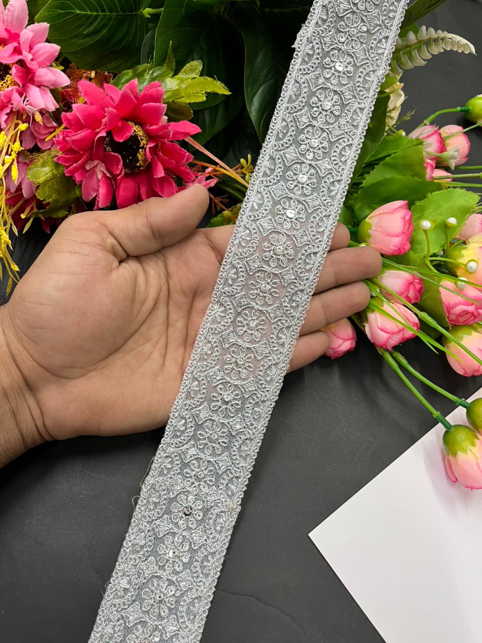 Gold Embroidered Zari Lace Trims – Premium 2 Inch Designer Border for Sarees, Dupattas, Lehengas & Festive Wear (9 Meter) | Silver