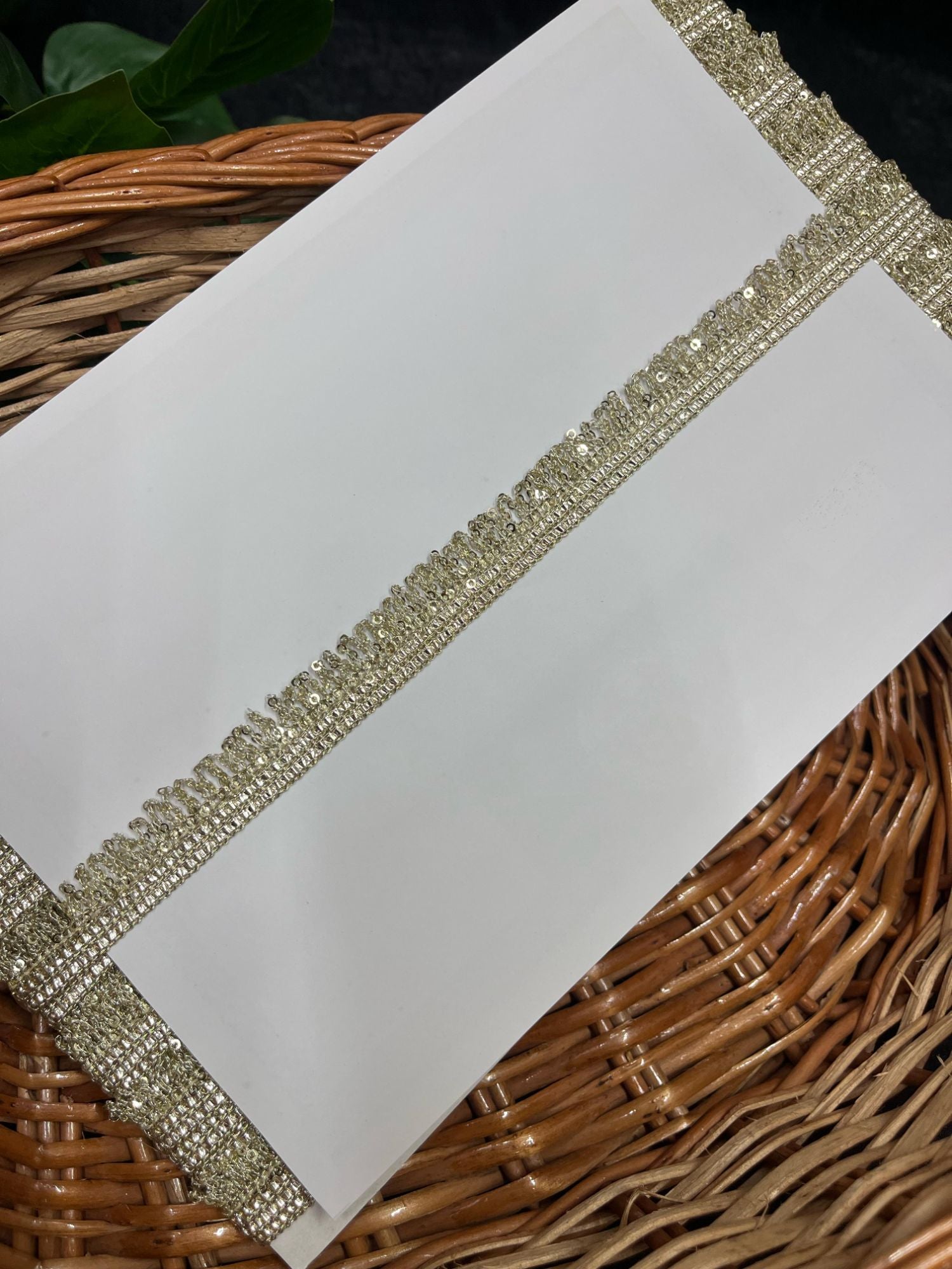 - Product Code: DC0007 – High-quality gold zari fringe lace with shimmering sequin embellishments.
