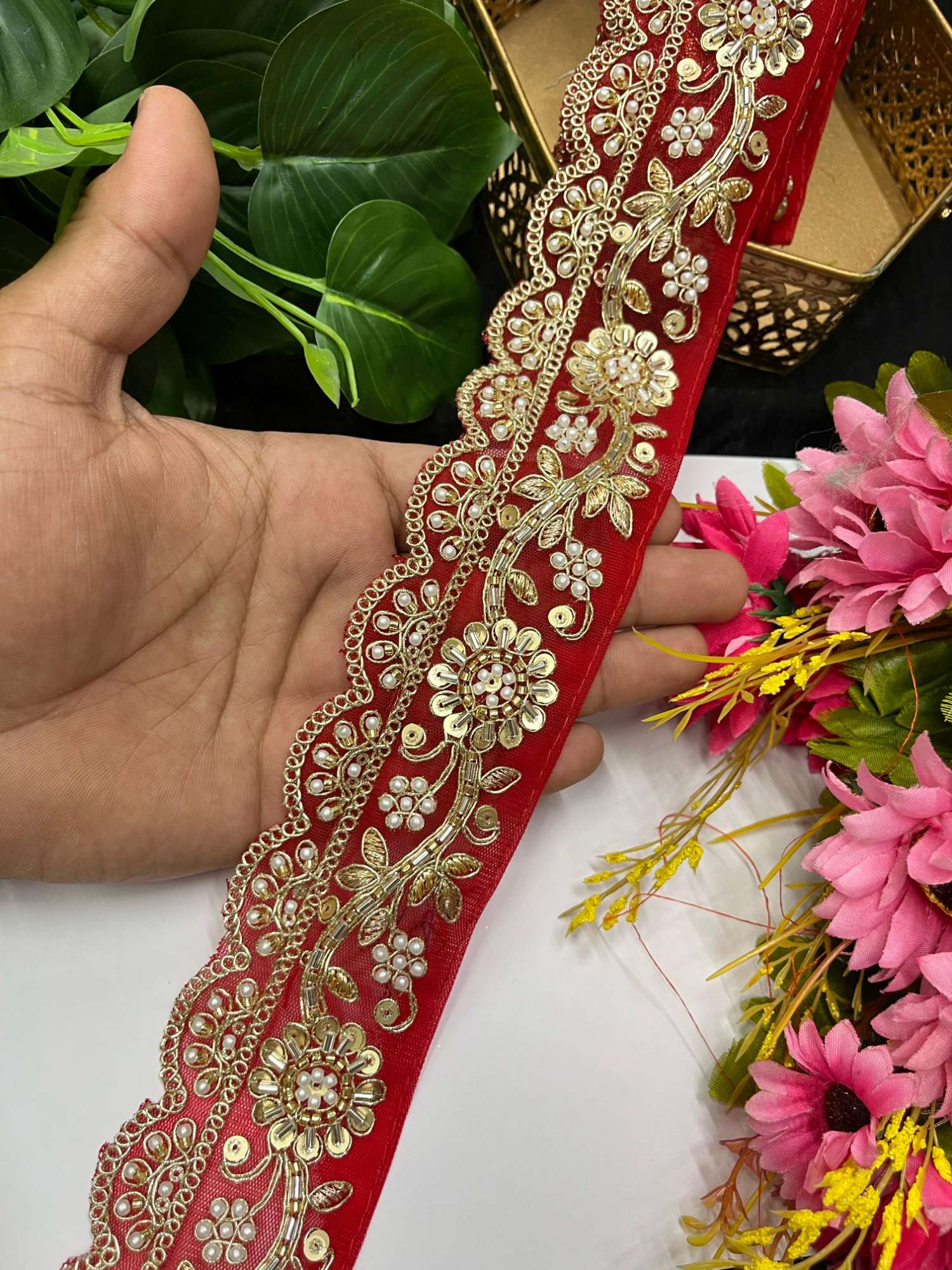 Gorgeous Embroidered Pearl & Cutdana Designer Lace – 9 Meters, 2.5-Inch Maggam Work Border for Sarees & Lehengas | Red