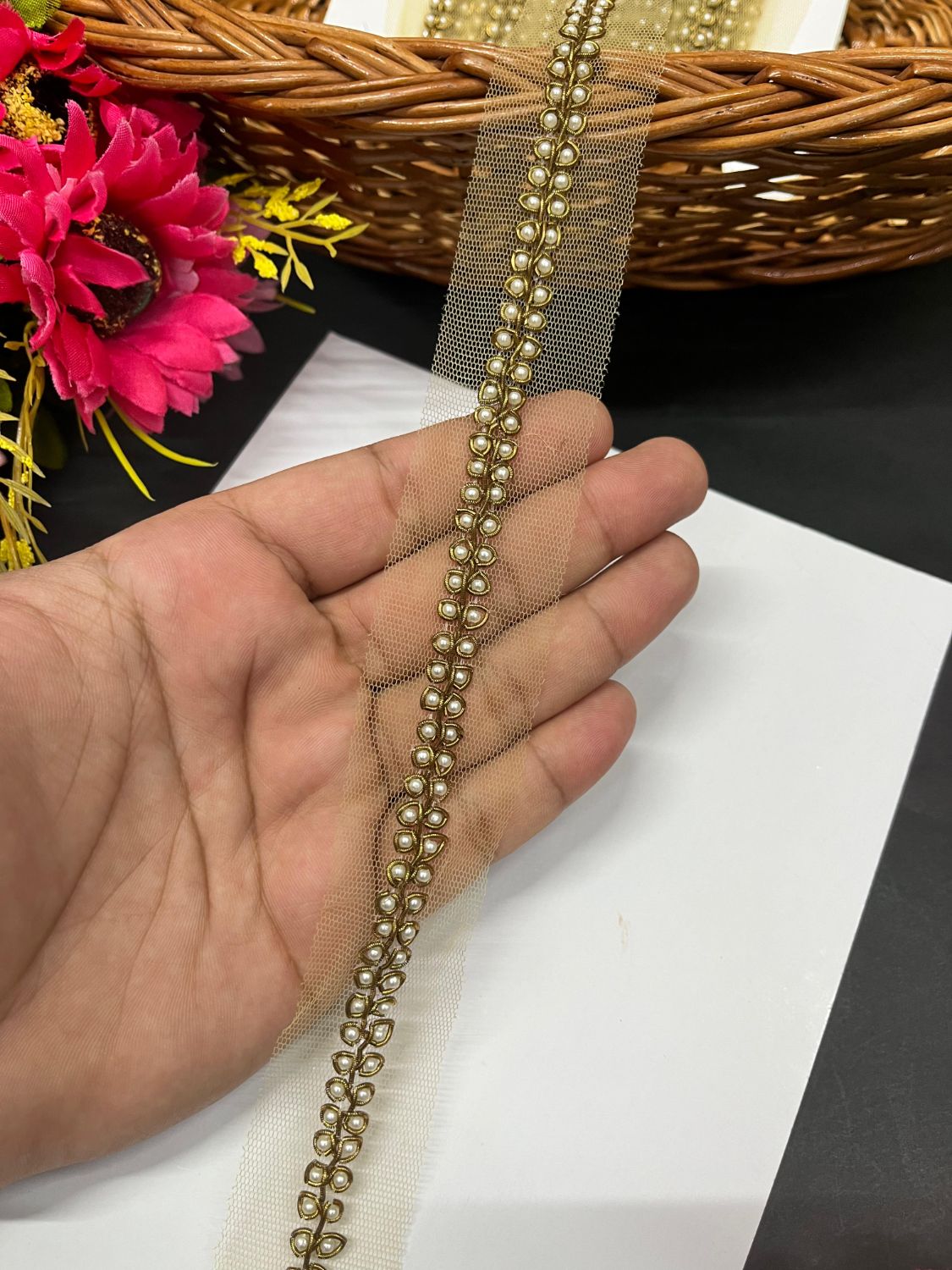 Handcrafted Beaded Lace on Net Fabric – Elegant Designer Border Trim for Sarees, Lehengas & Dresses (9 Meter, 0.5 Inch Width) | Antique