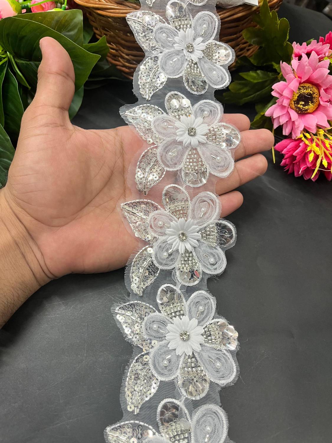 Handcrafted Silver Lace with Sequin Flower Beaded Design – Imported Decorative Lace for Sarees, Dupattas, and Dresses (9 mtr, 3 inch)