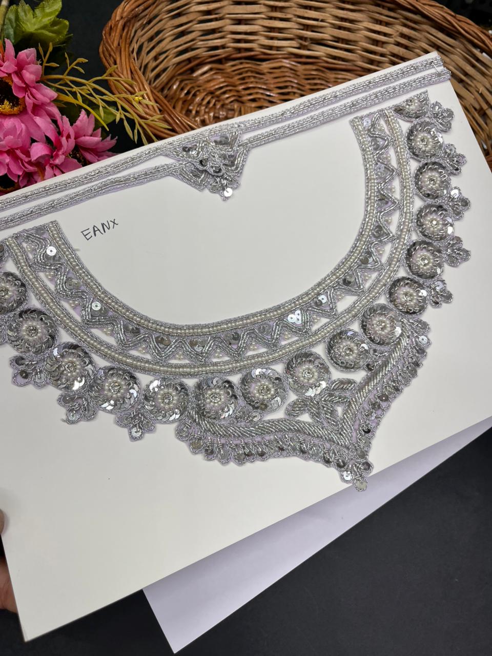Handwork Zardozi Neck Patch With Sleeves – Premium Designer Embroidered Neckline for Kurtis, Blouses, Suits & Ethnic Outfits | Silver