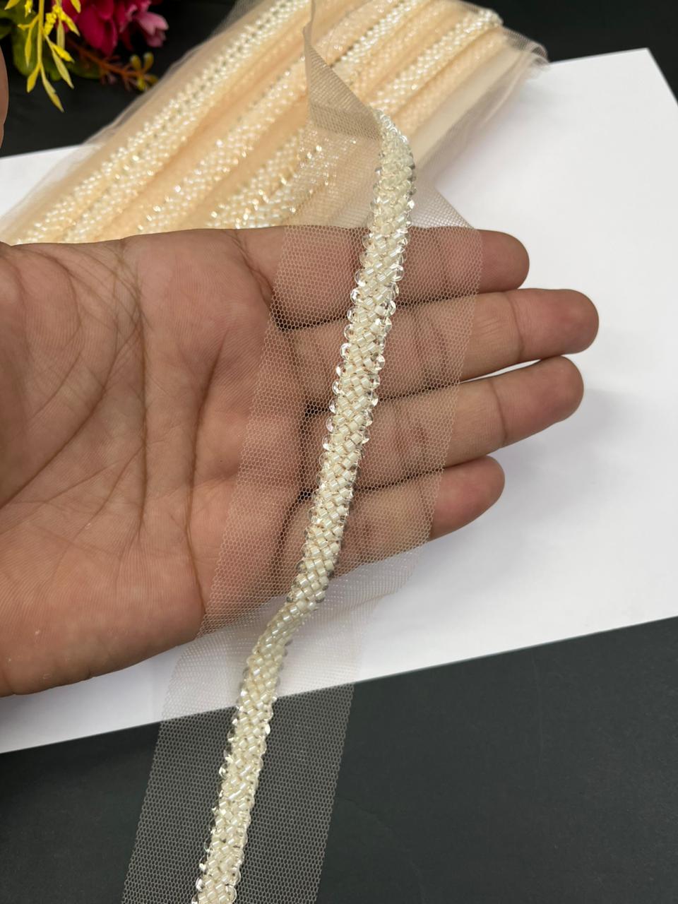 - High-quality imported beaded lace trims featuring fine beadwork and elegant detailing