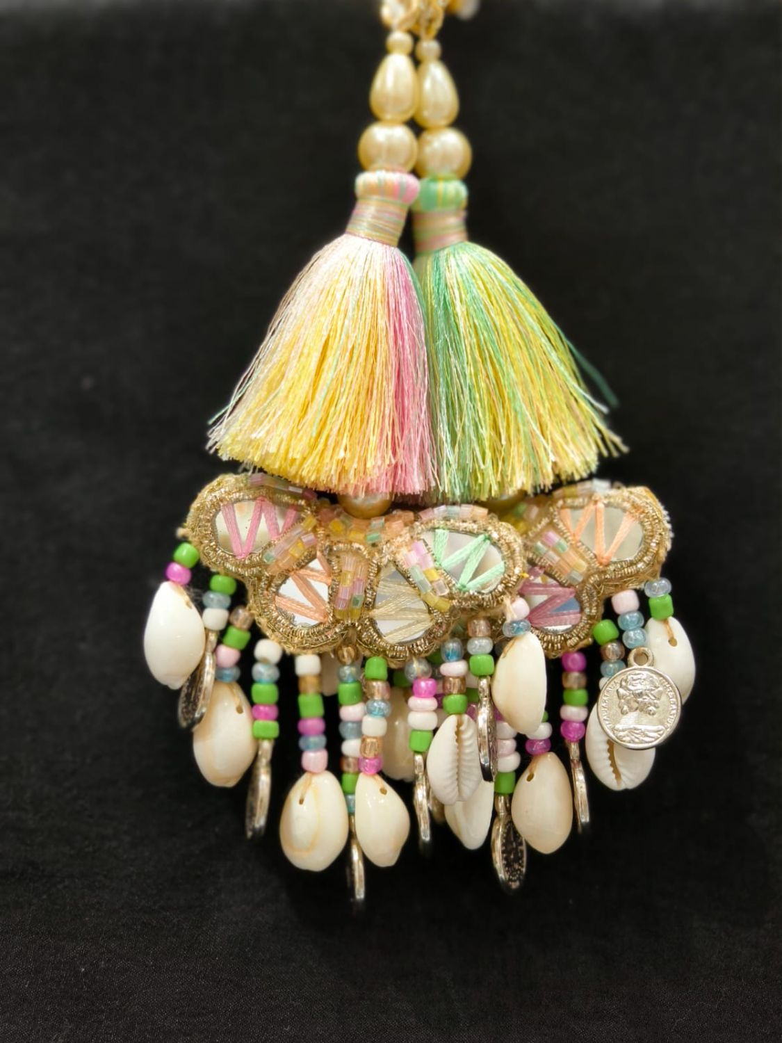 - Handcrafted tassels featuring light multi-colored threads, coin mirrors, and scalloped design