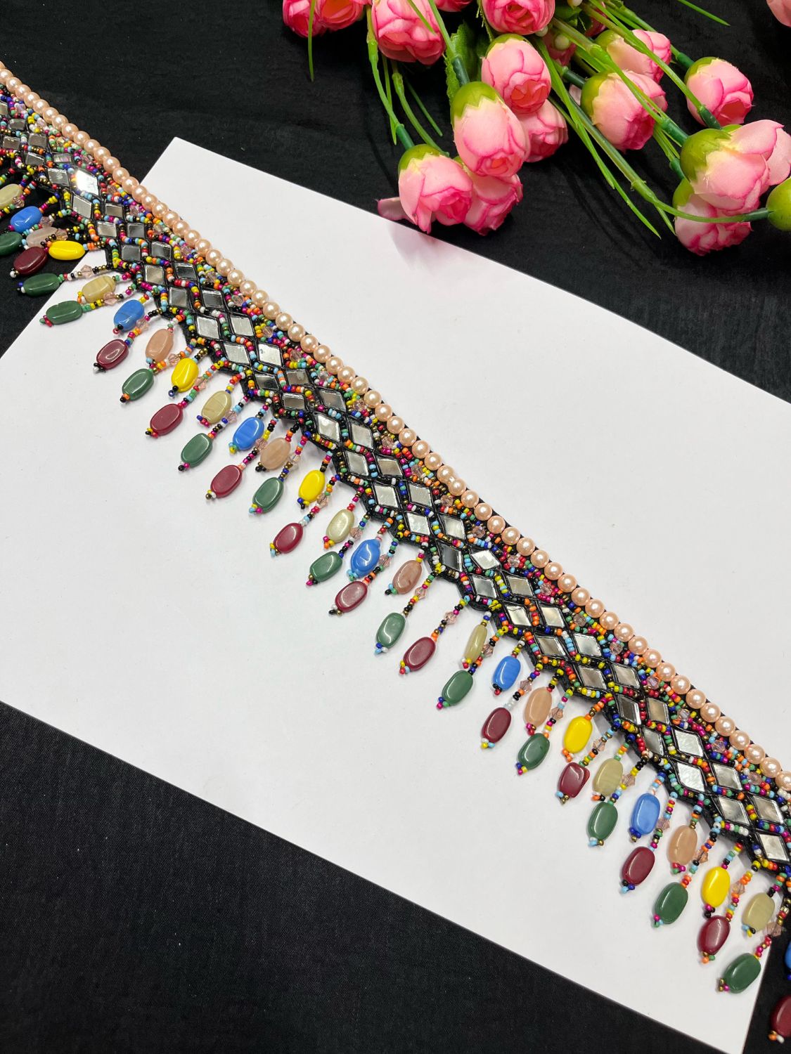 - Design: Handcrafted beadwork with reflective mirror embellishments