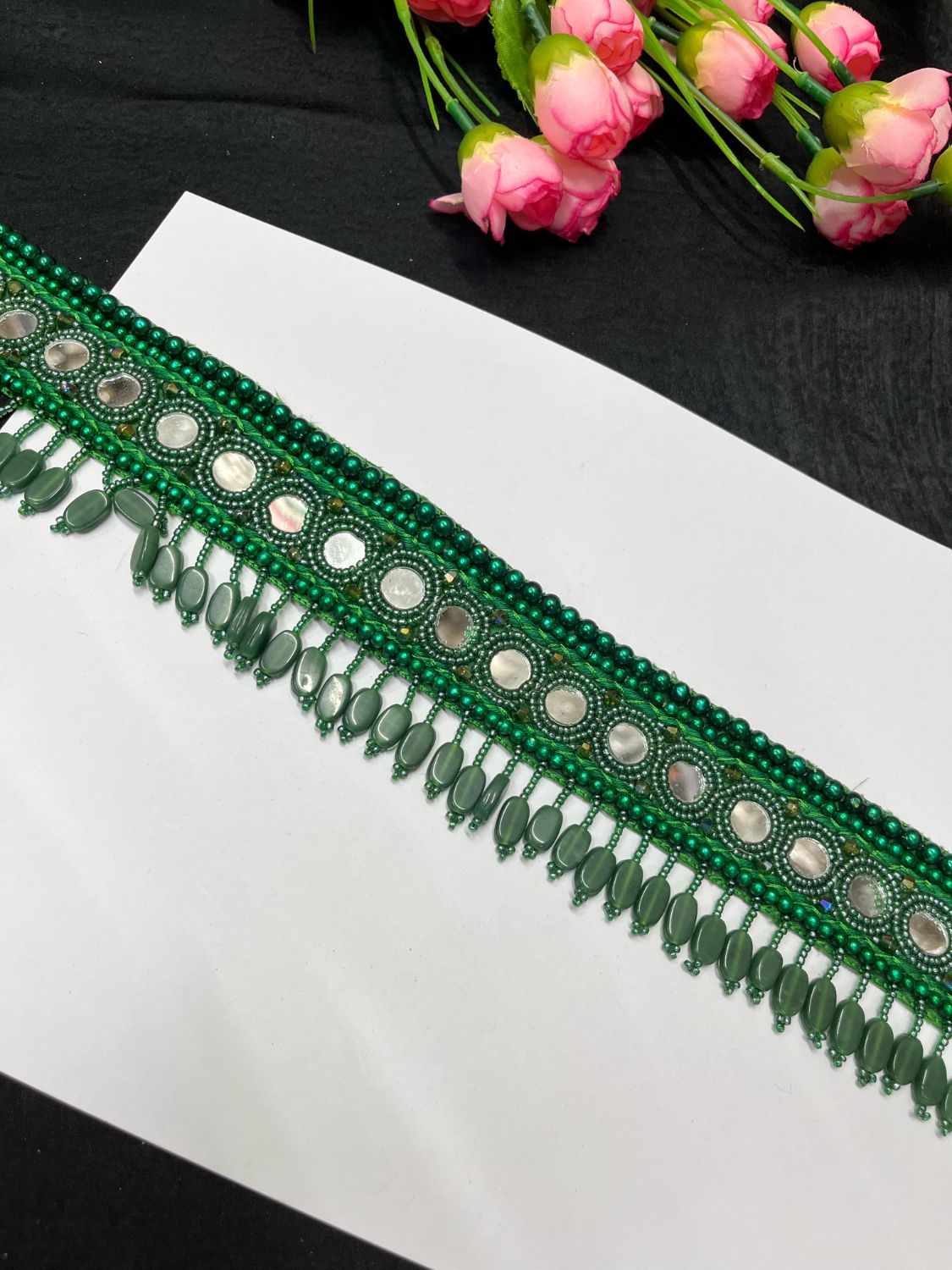 - Design: Handcrafted beadwork with reflective mirror embellishments