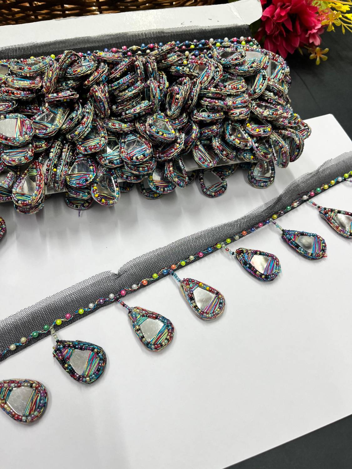 - Premium hanging lace crafted with multi-shaded threads and authentic real mirror work on soft net fabric