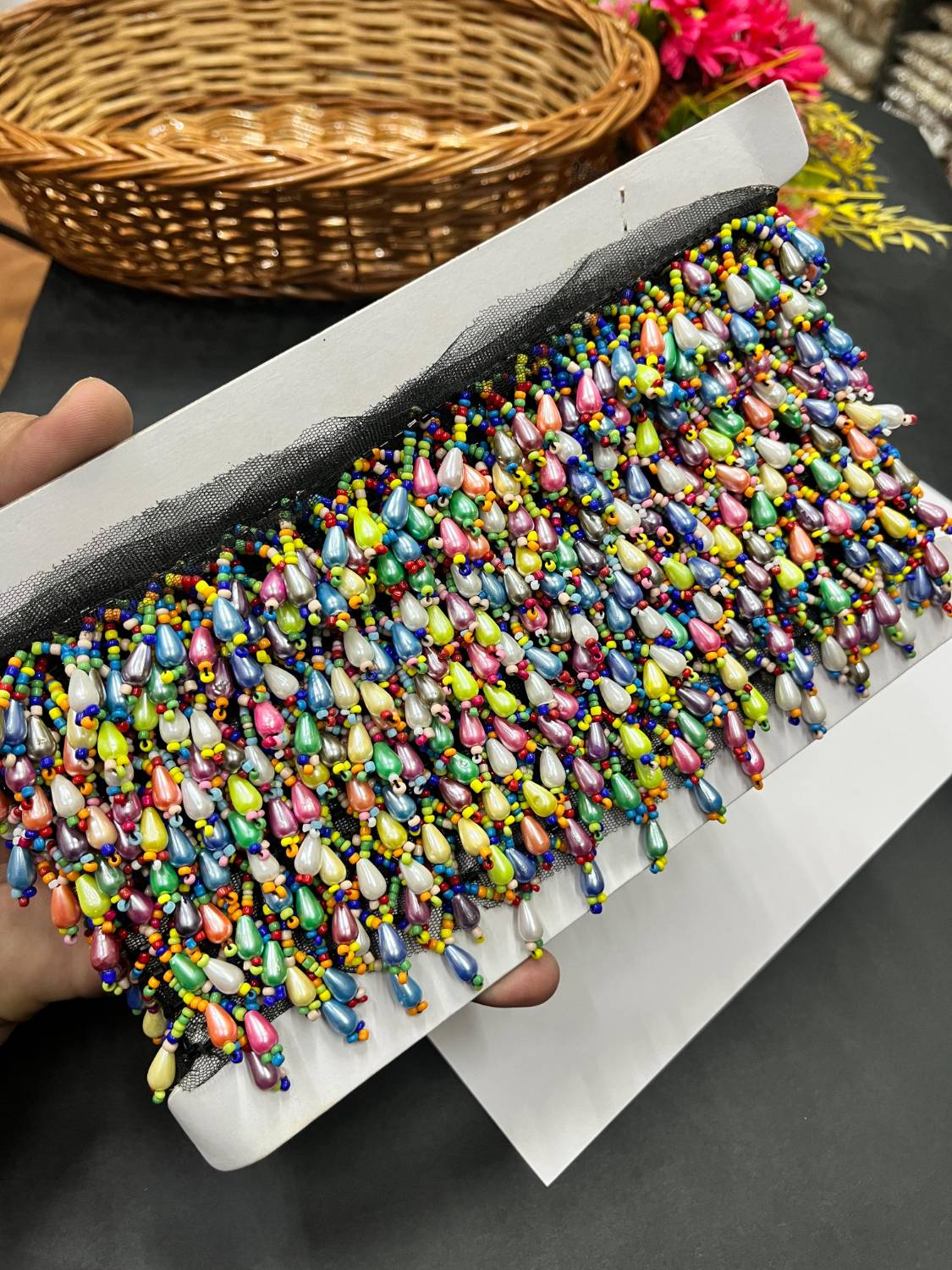 Multicoloured Beads Hanging Lace on Net Fabric – Decorative Latkan Lace for Sarees, Dupattas, and Dresses (9 mtr, 1 inch)