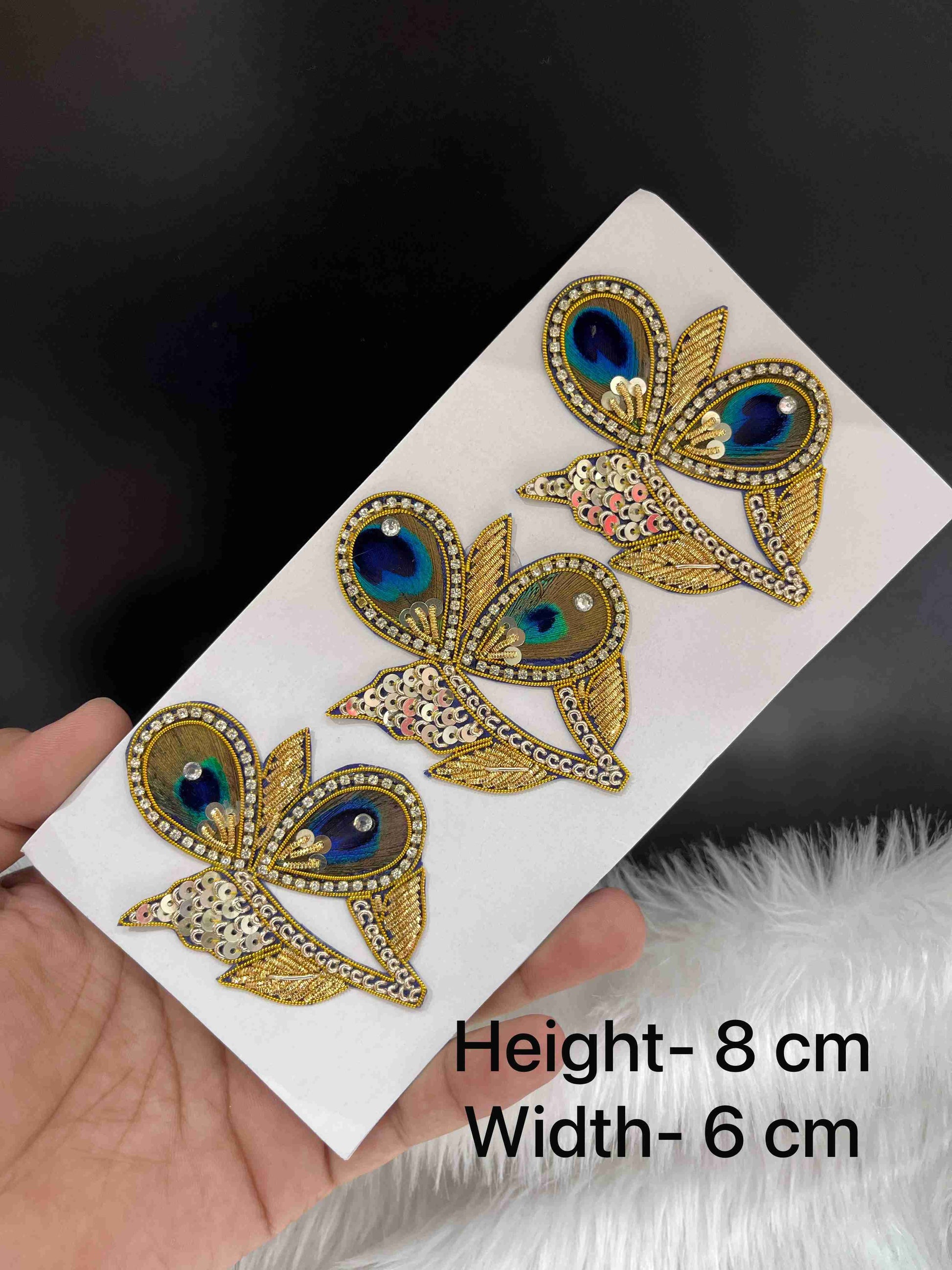 Enhance your ethnic creations and festive crafts with our Multicoloured Zardosi Work Decorative Patch Set (3 pcs). Designed in a beautiful peacock feather-inspired shape, each patch is adorned with real feather inserts, intricate golden zari embroidery, shimmering sequins, and sparkling diamond stones. This set of three is perfect for blouse borders, lehenga layouts, or symmetrical art styling.