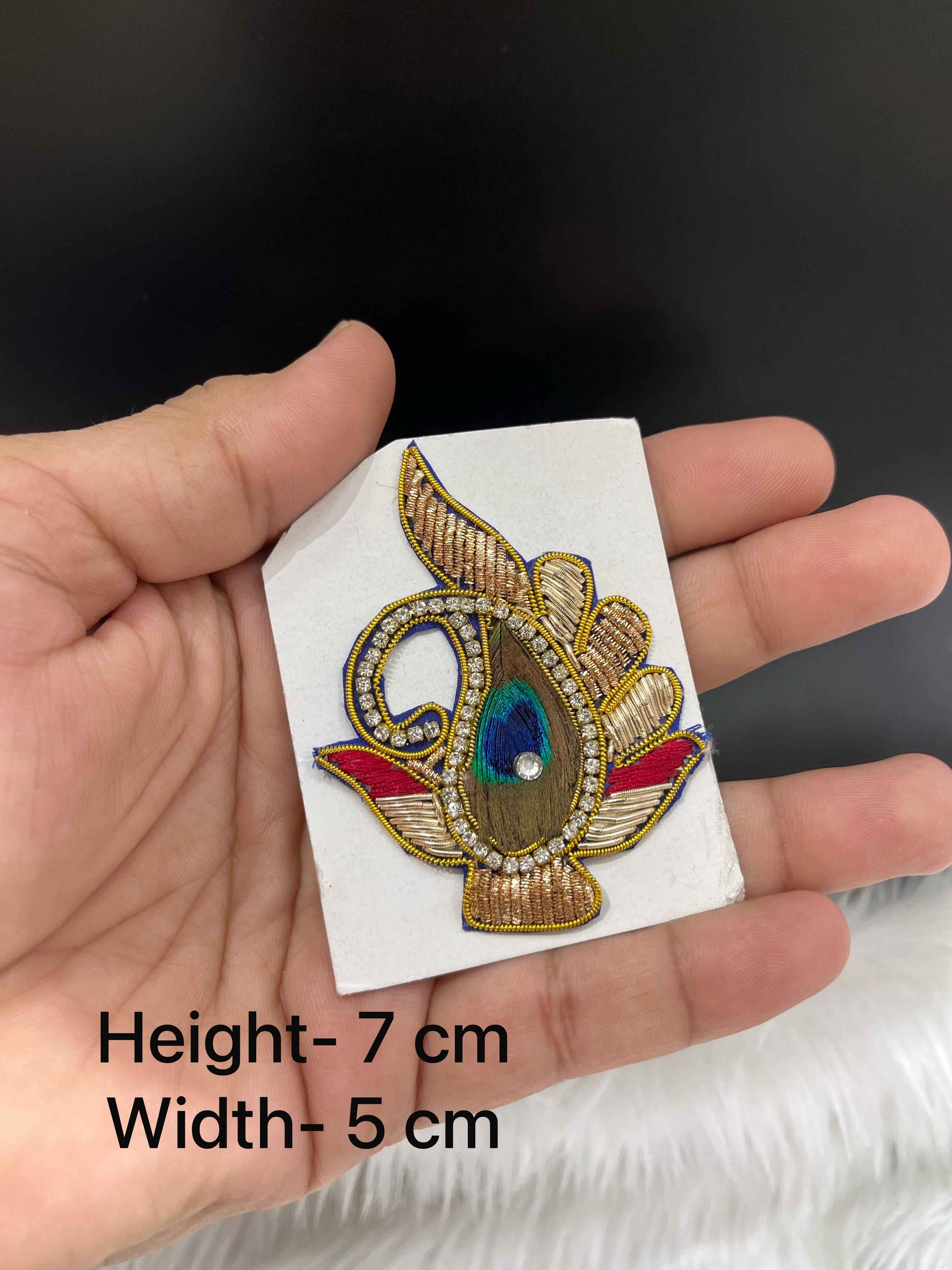 Celebrate elegance and tradition with our Multicoloured Zardosi Work Decorative Patch. This compact applique features an intricately designed peacock feather motif with rich gold zari embroidery, vibrant thread detailing in red and blue, a real feather center, and a line of shimmering crystal stones. A beautiful blend of artistry and heritage for your festive and ethnic creations.