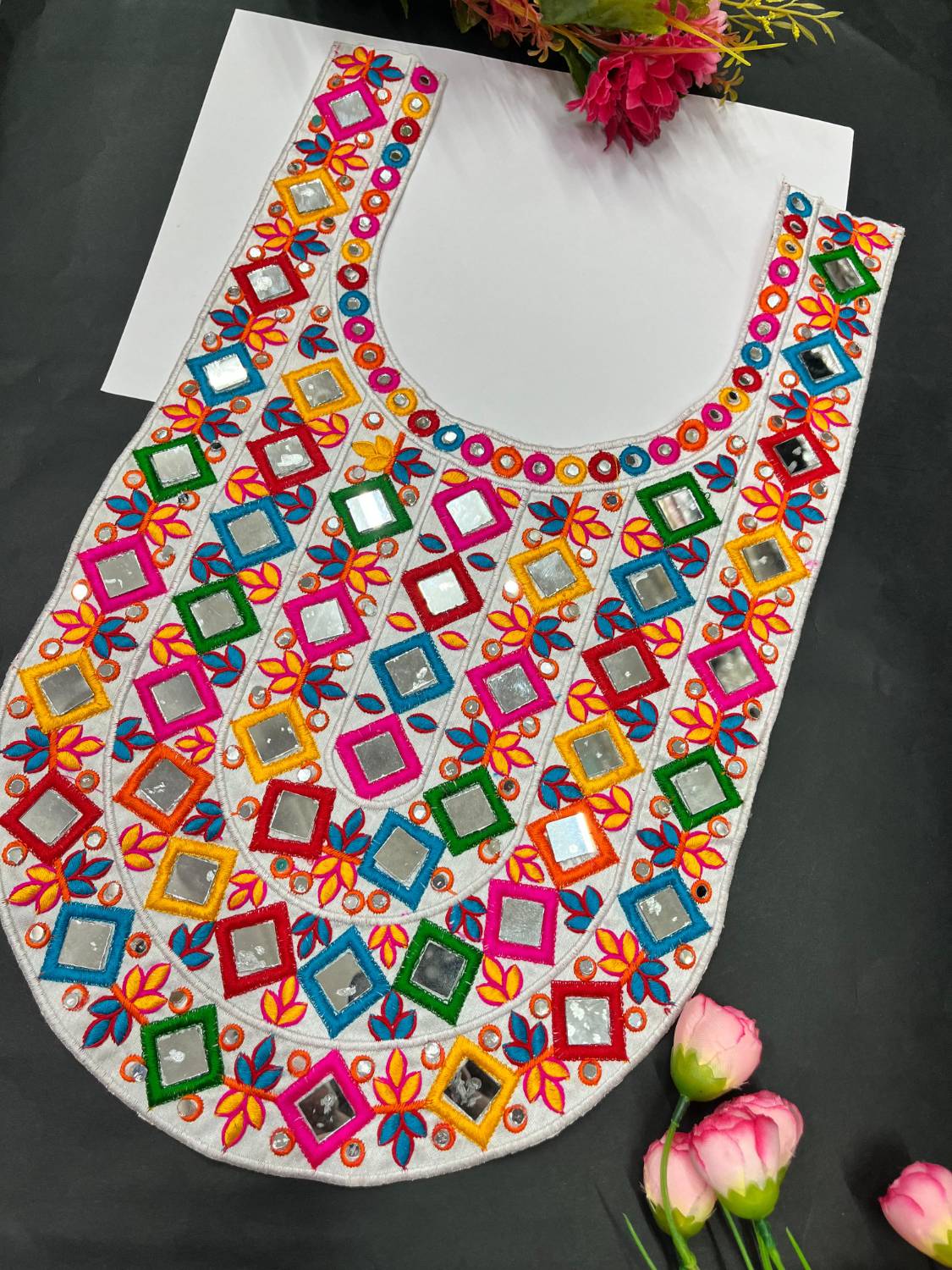 - Beautifully handcrafted neck patch featuring authentic real mirror work, perfect for Navratri and festive occasions