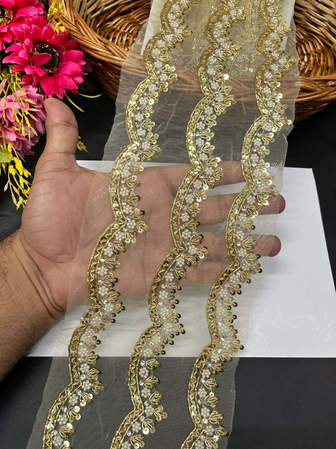 Net Based Pearl & Zardosi Work Handcrafted Lace – Handmade Decorative Lace for Sarees, Dupattas, and Dresses (9 mtr, 1 inch) | Gold