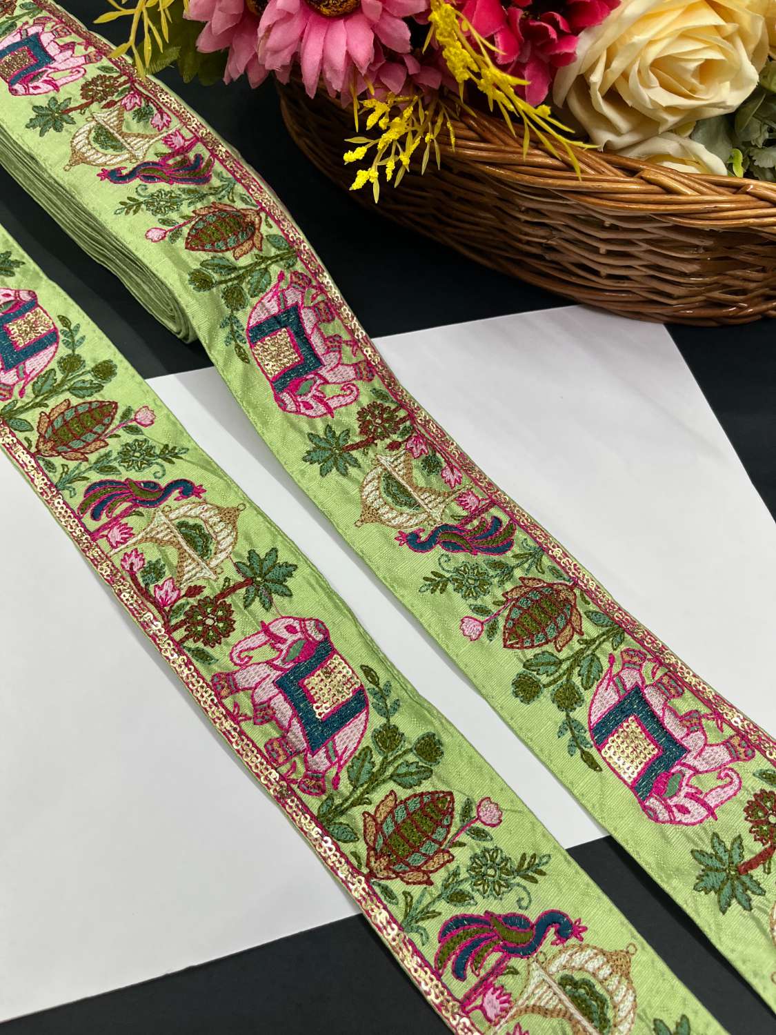 - Design: Intricately embroidered with elegant peacock and elephant face motifs, perfect for boutique-style sarees and dupattas.