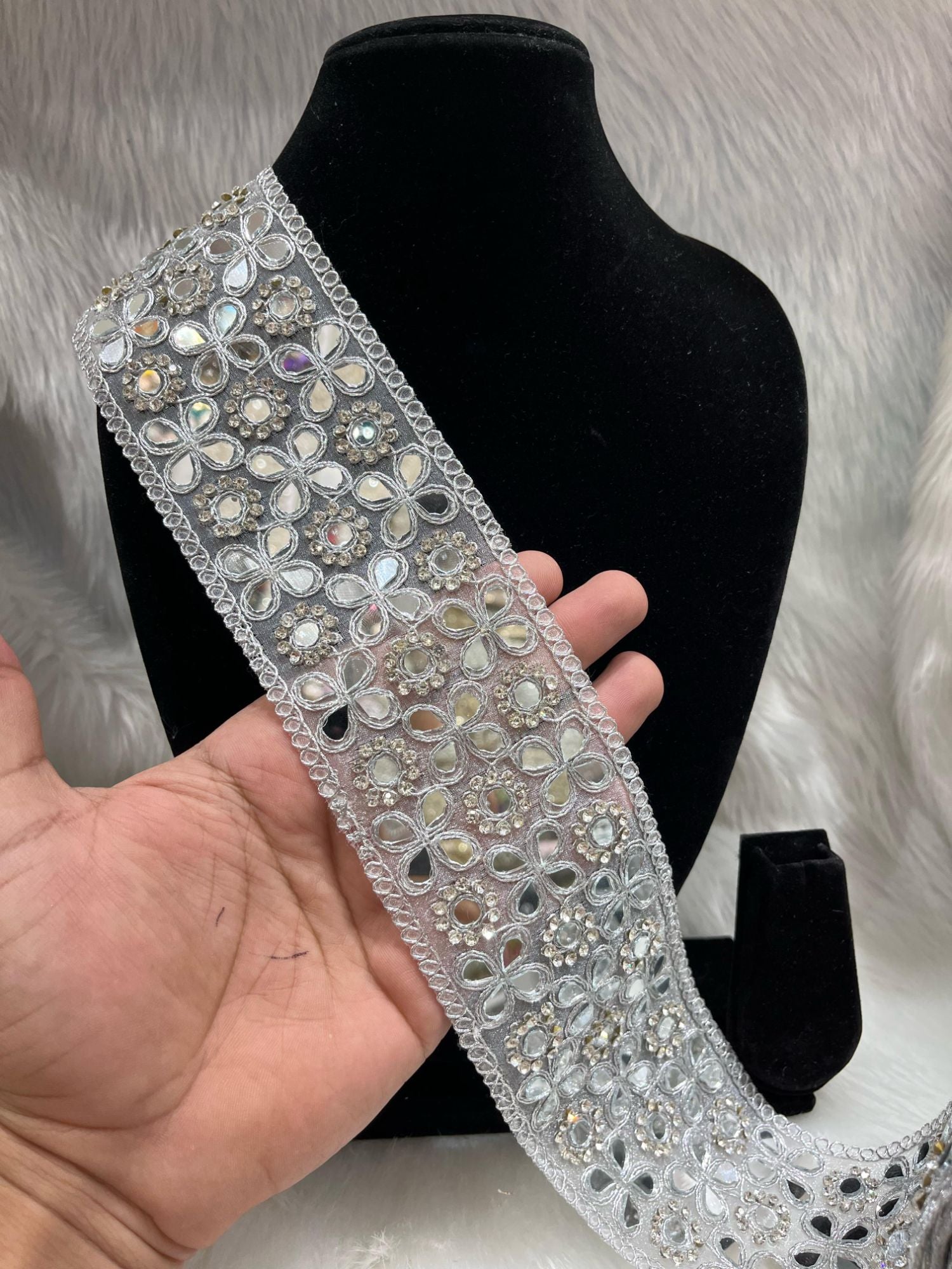 Real Mirror Lace with Rhinestone – 9 Meters, 3-Inch Heavy Decorative Saree Laces for Lehengas, Dupattas & Ethnic Wear | Silver