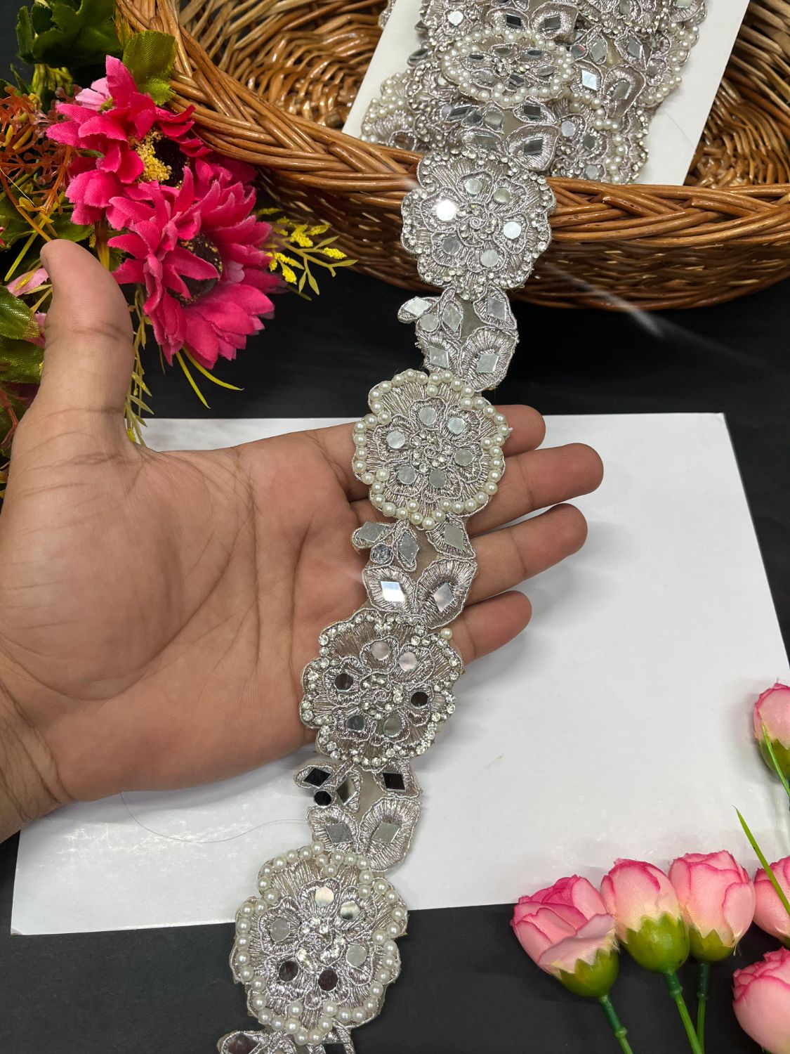 Real Mirror Work Designer Lace for Sarees – Traditional Handmade Border Trim for Lehengas, Dupattas & Ethnic Outfits (9 Meter, 2 Inch Width) | Silver