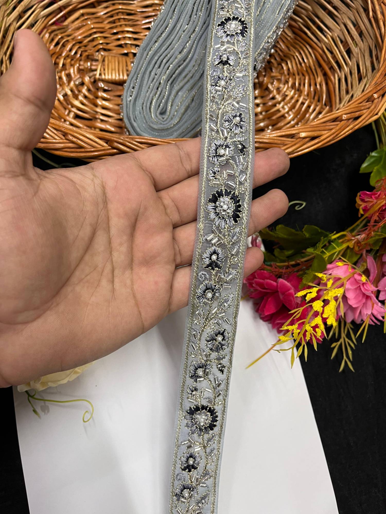 Resham Work Katdana Saree Laces – 9 Meters, 1-Inch Thread Embroidered Border Trim for Sarees, Lehengas & Dupattas | Grey