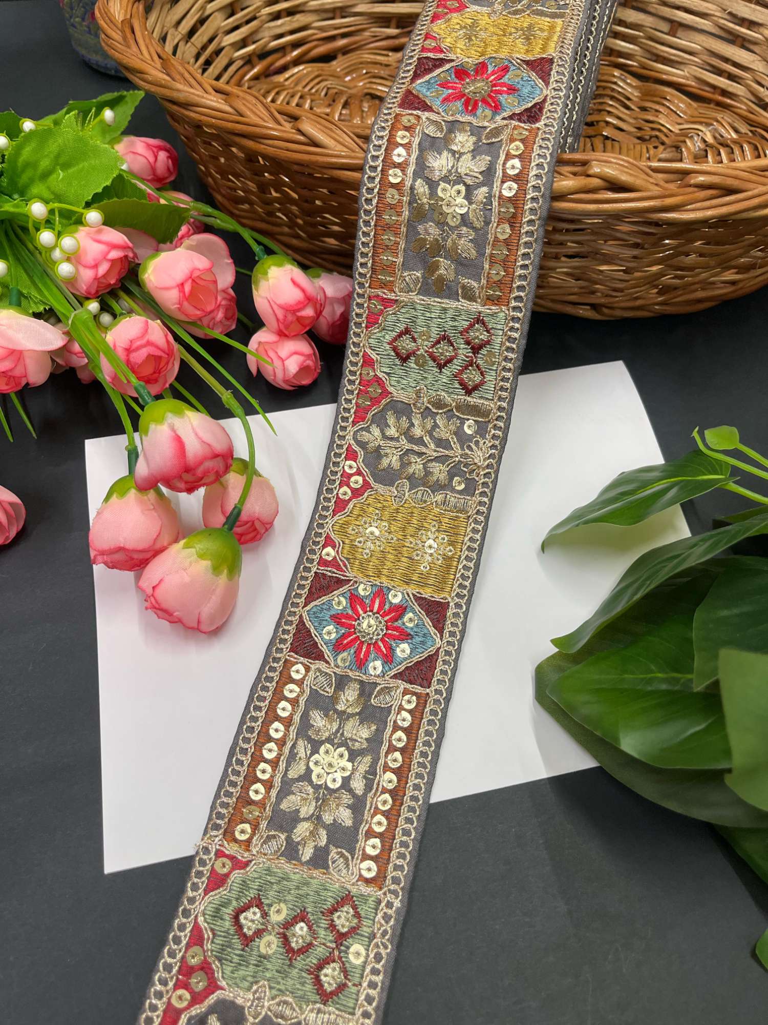 Sabyasachi Inspired Embroidered Sari Border with Zari & Sequin – 9 Meters, 2.5-Inch Designer Lace for Sarees & Lehengas | Grey