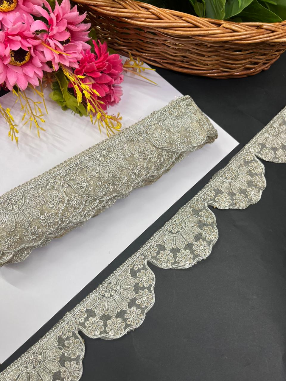 - Premium scalloped zari lace featuring intricate gold embroidery and elegant traditional detailing