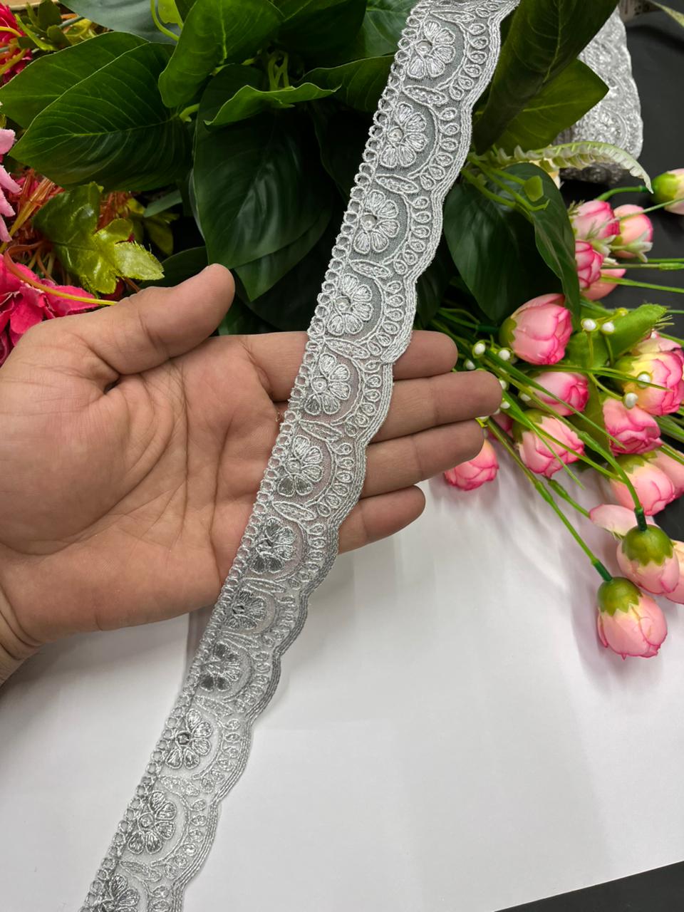 Scalloped Embroidered Zari Lace Designs – Premium 1.5 Inch Gold Designer Border for Sarees, Dupattas & Festive Wear (9 Meter) | Silver