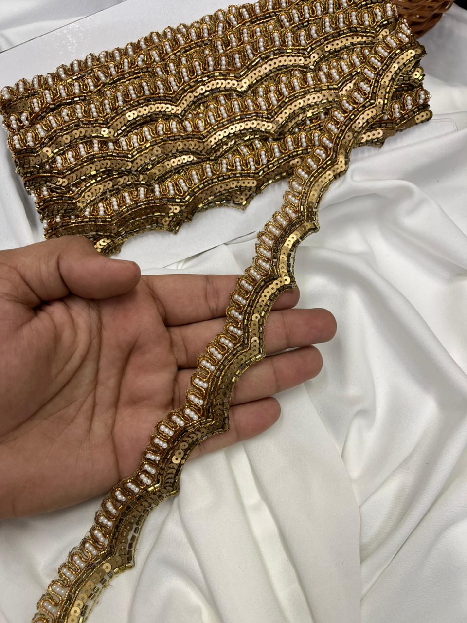 Scalloped Handmade Sequins Zardozi & Pearl Lace for Sarees, Kurtis & Dresses – Designer Embroidered Lace Border | Antique