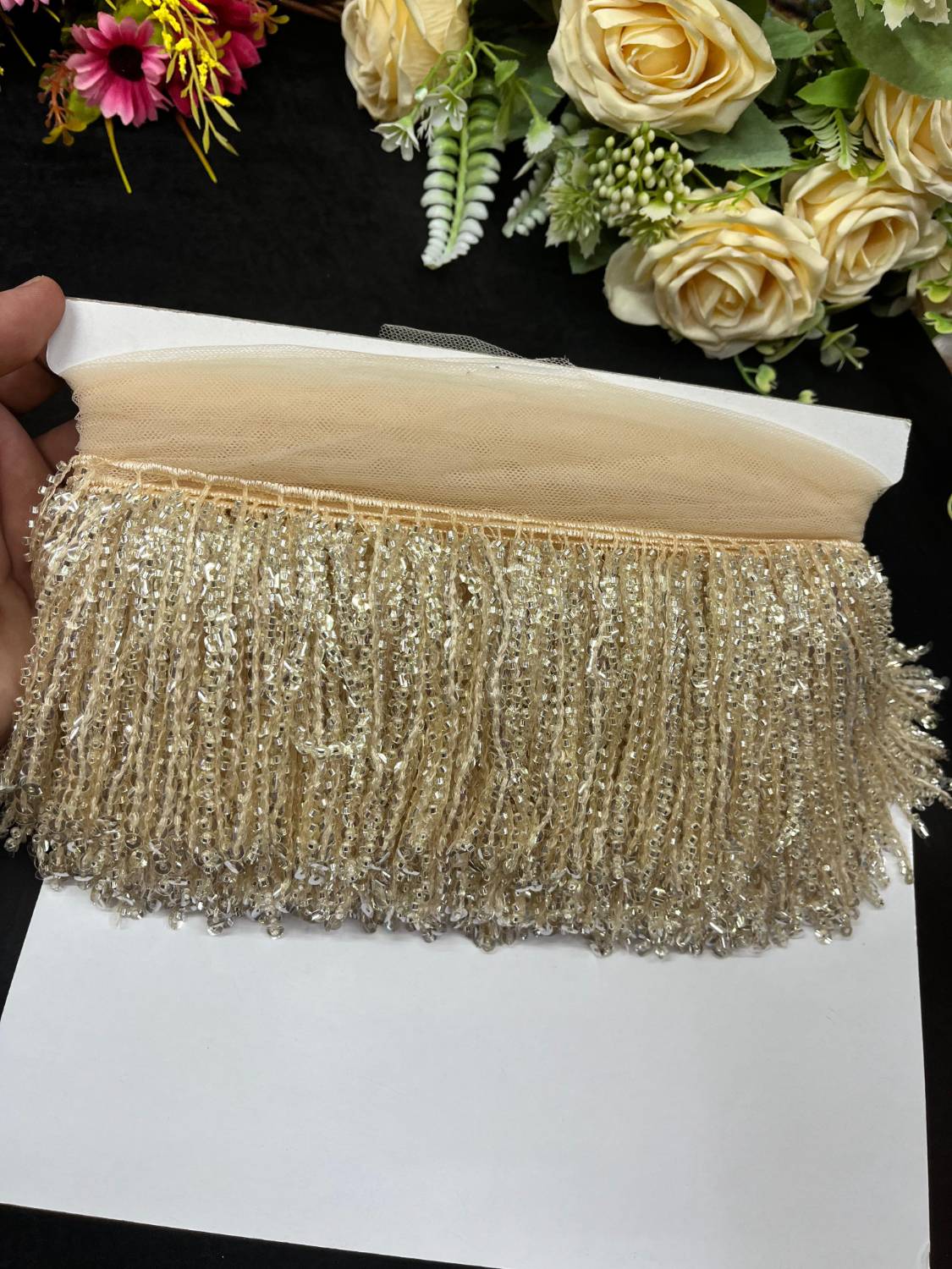 Sequence Fringe Lace | Western Imported Lace | Tassels Lace – Premium Designer Border Trim for Sarees, Lehengas & Gowns (9 Meter, 4 Inch Width) | Light Gold