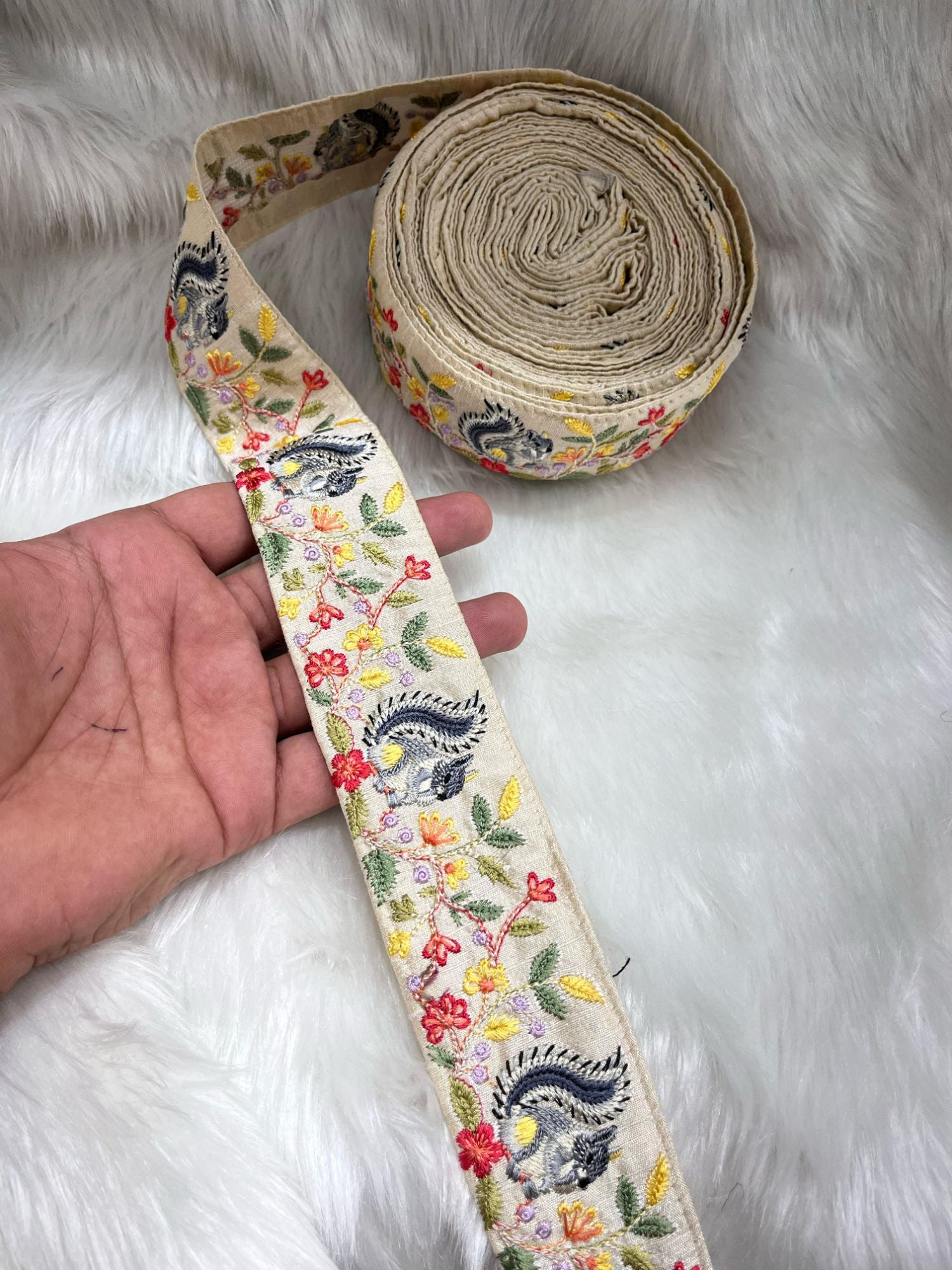 - Width: 1.75 inches – Elegant embroidered border featuring a charming squirrel design on a silk base.