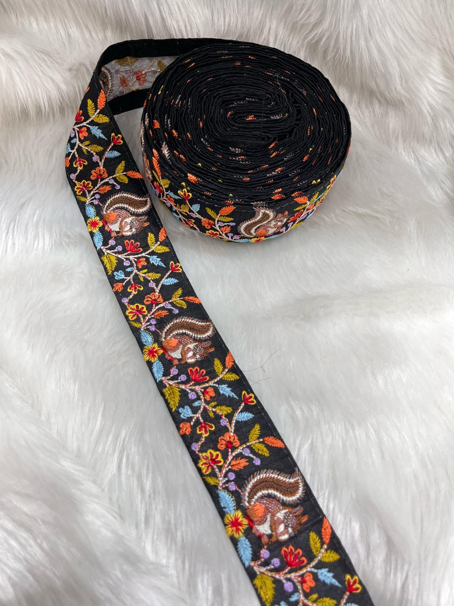 - Width: 1.75 inches – Elegant embroidered border featuring a charming squirrel design on a silk base.